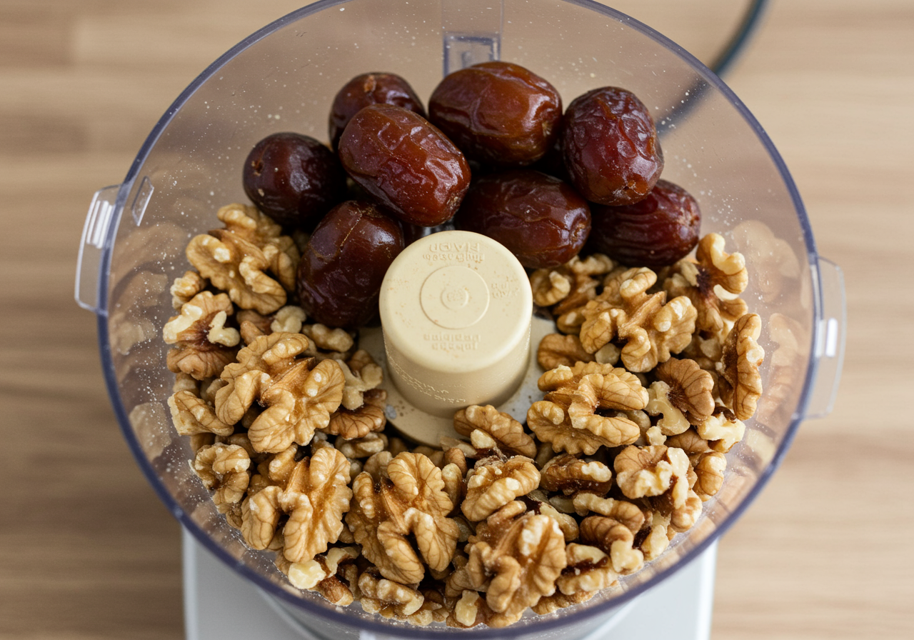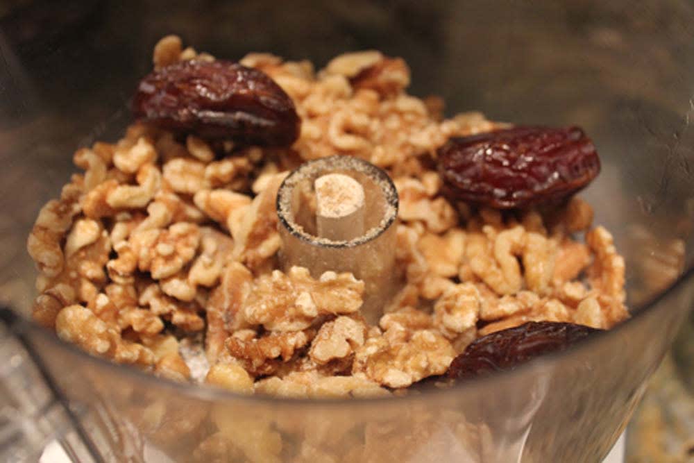 In Food Processor, add walnuts and dates, pulse to a medium crumb.