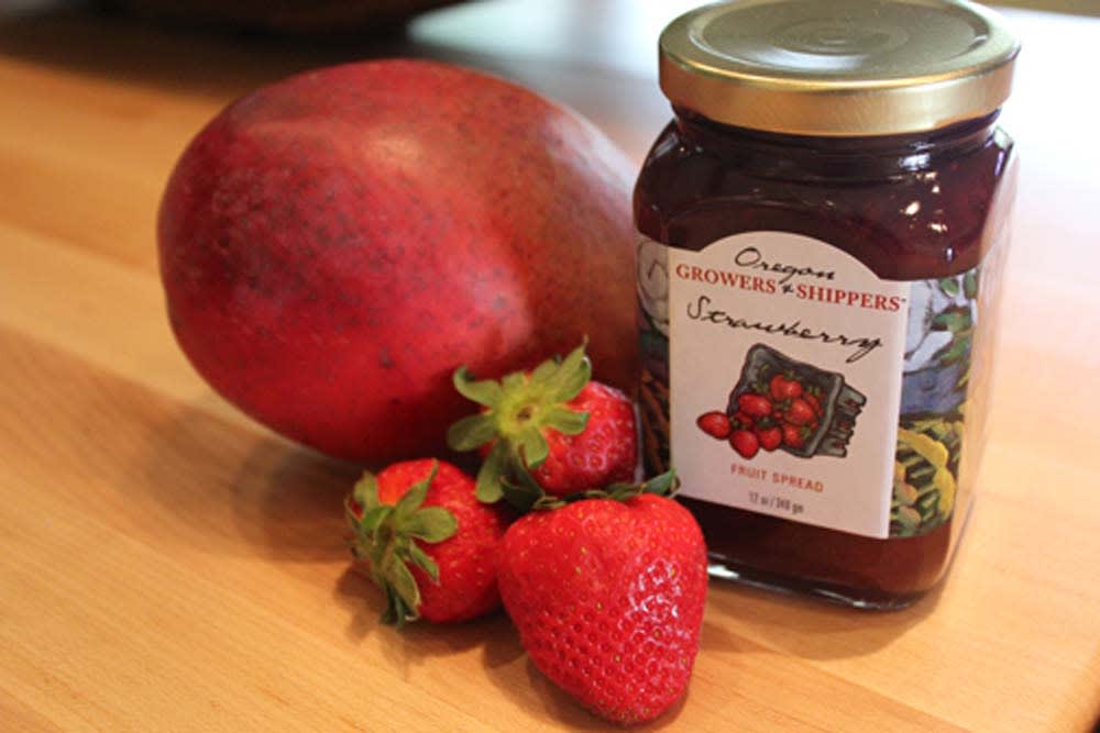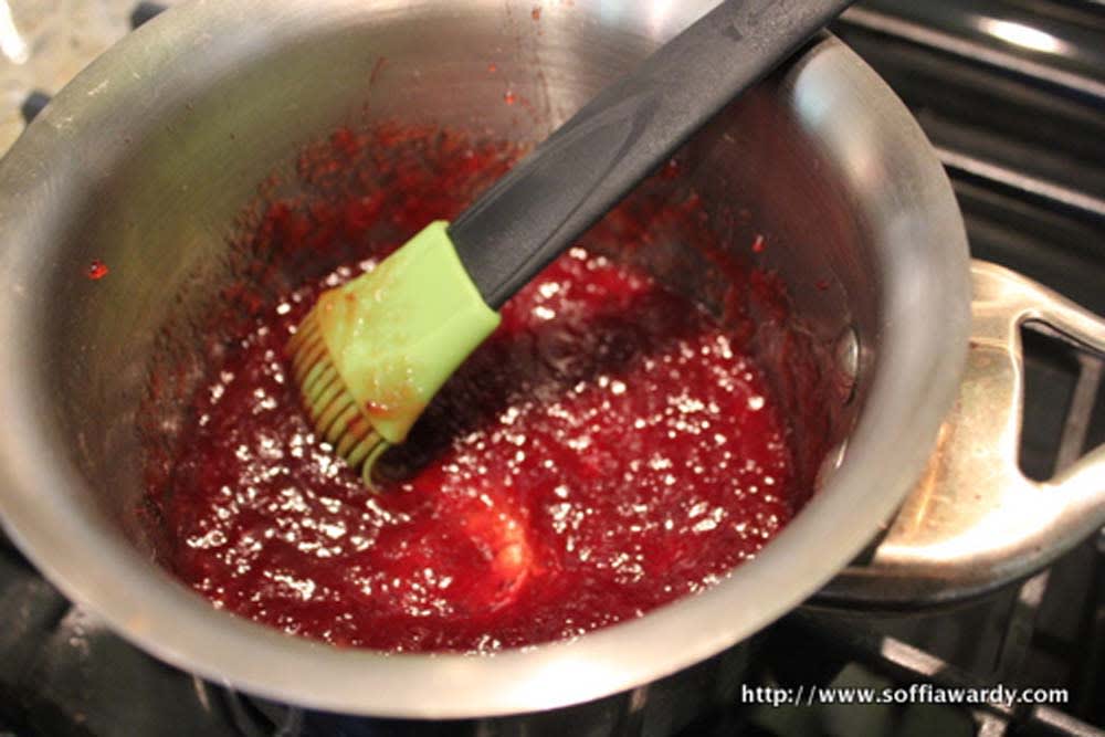 In a small sauce pan on medium heat mix strawberry jelly and Cointreau until melted and combined.