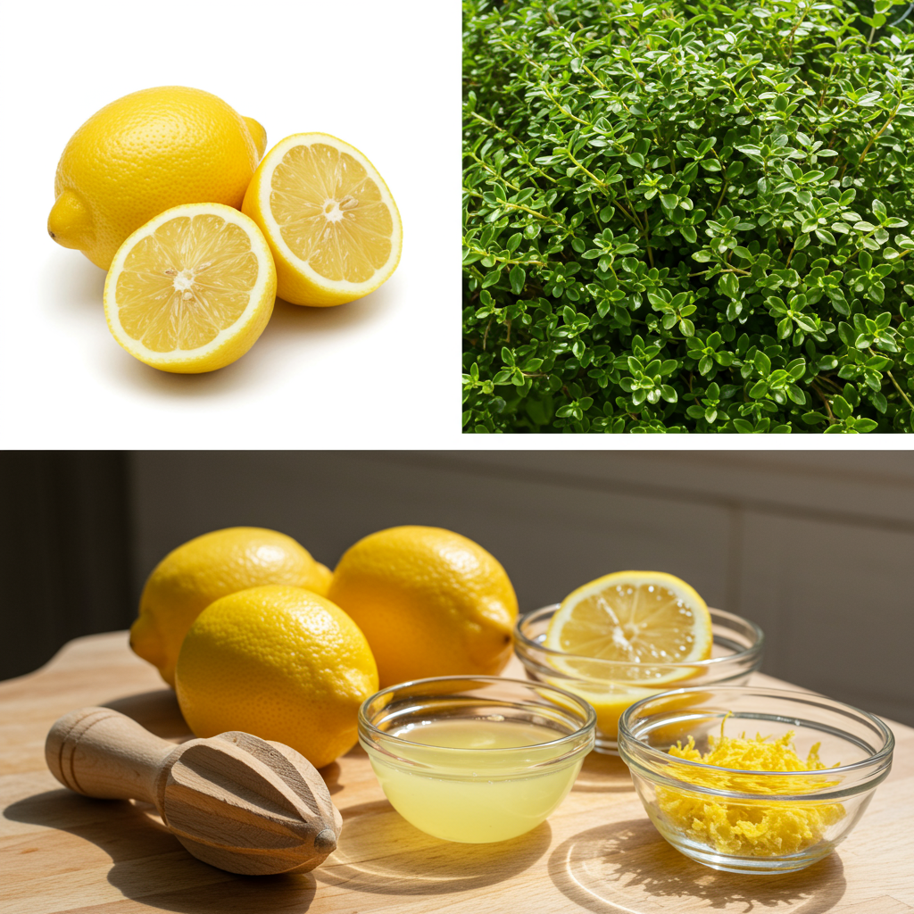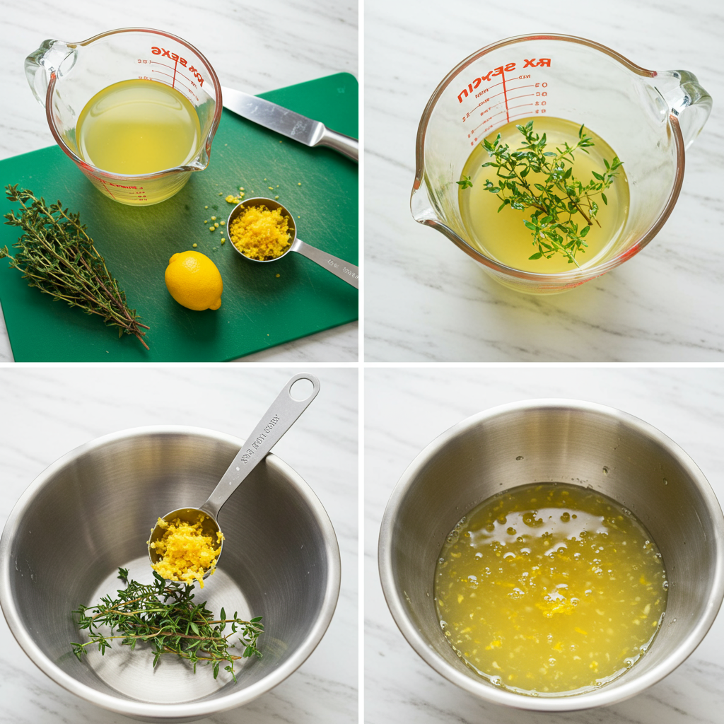 1. In a bowl, whisk together juice, thyme syrup and zest.