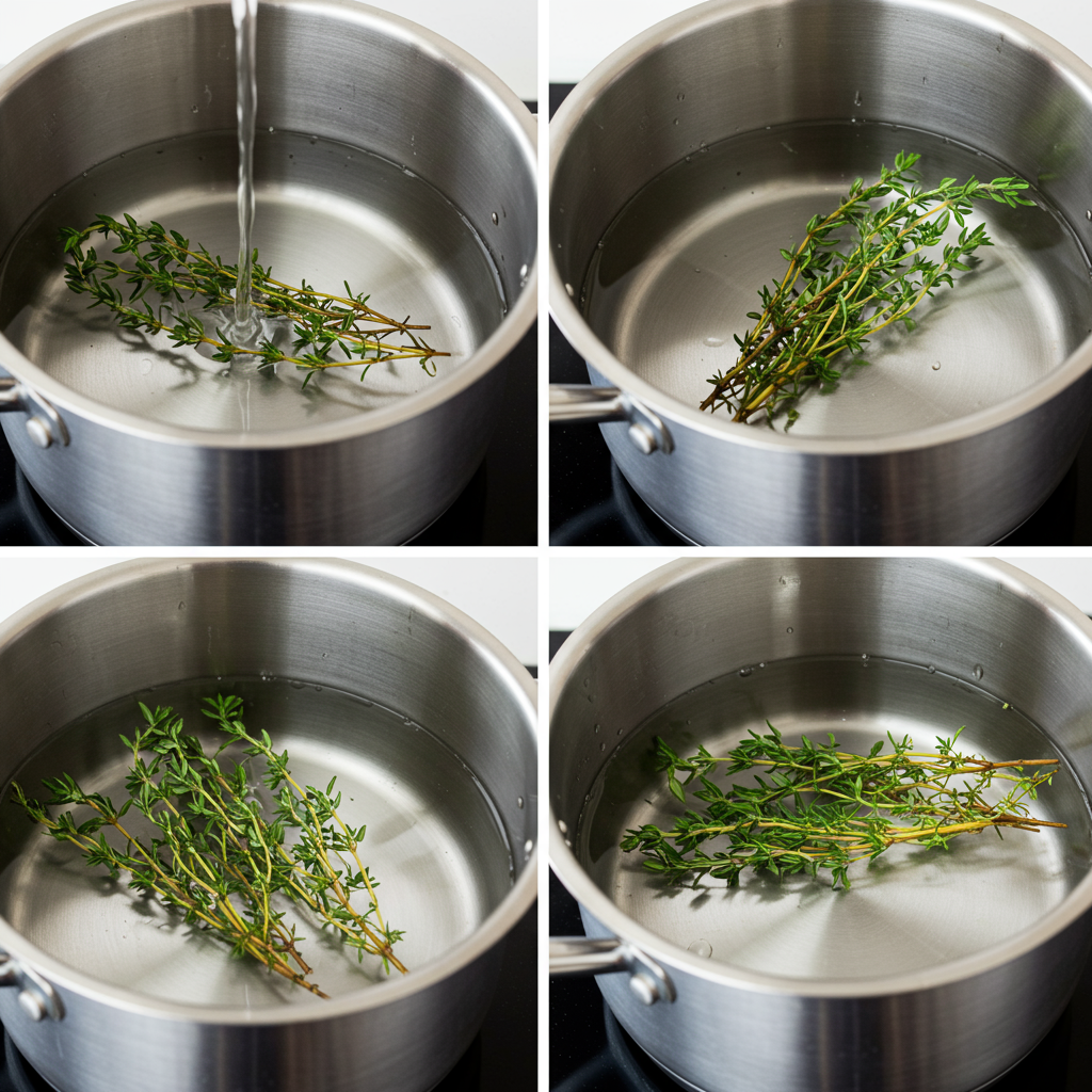 1. In a medium saucepan, combine water sugar and thyme leaves.