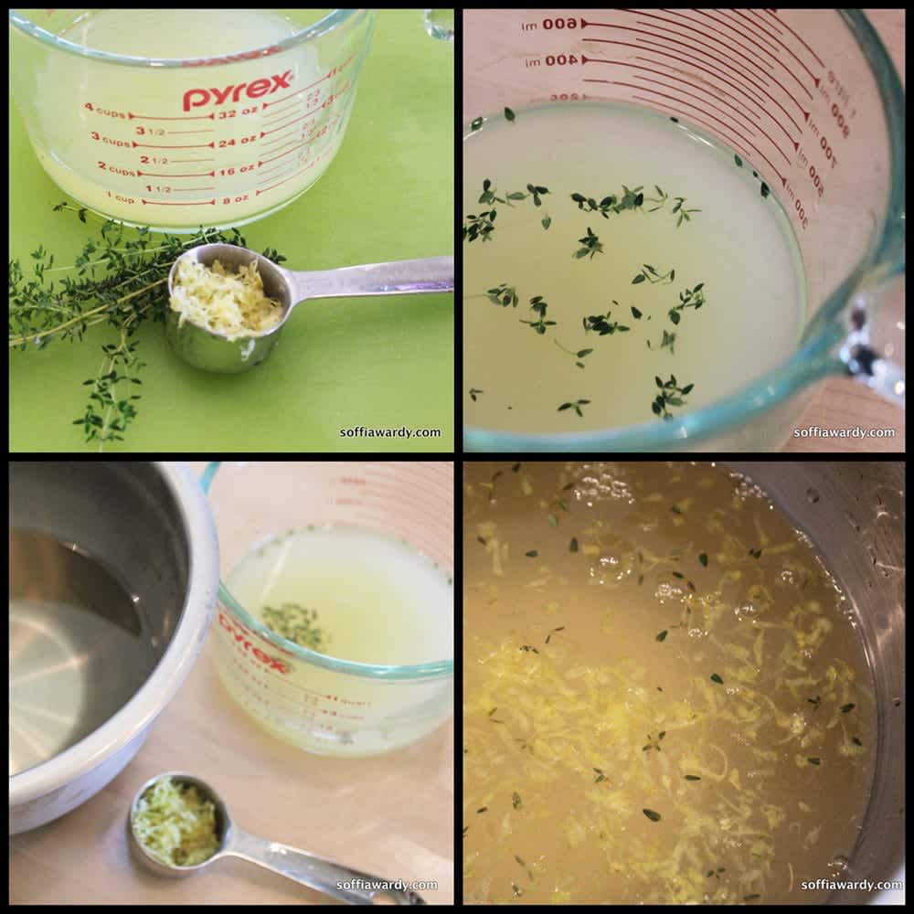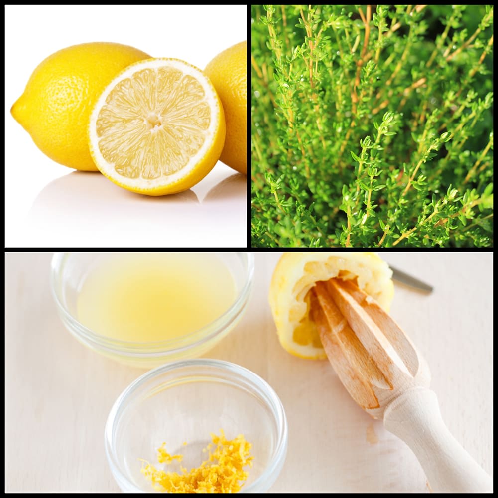 - In a bowl, whisk together juice, thyme syrup and zest.