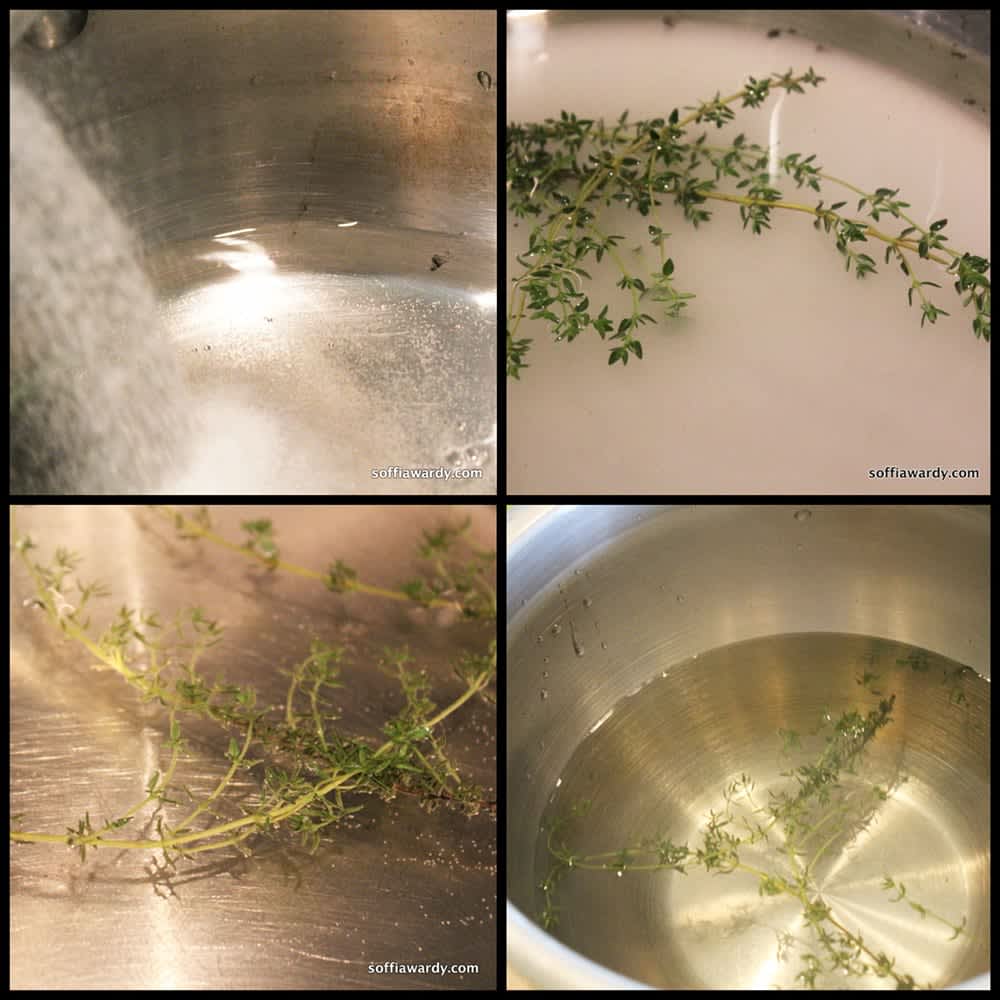 - In a medium saucepan, combine water sugar and thyme leaves.