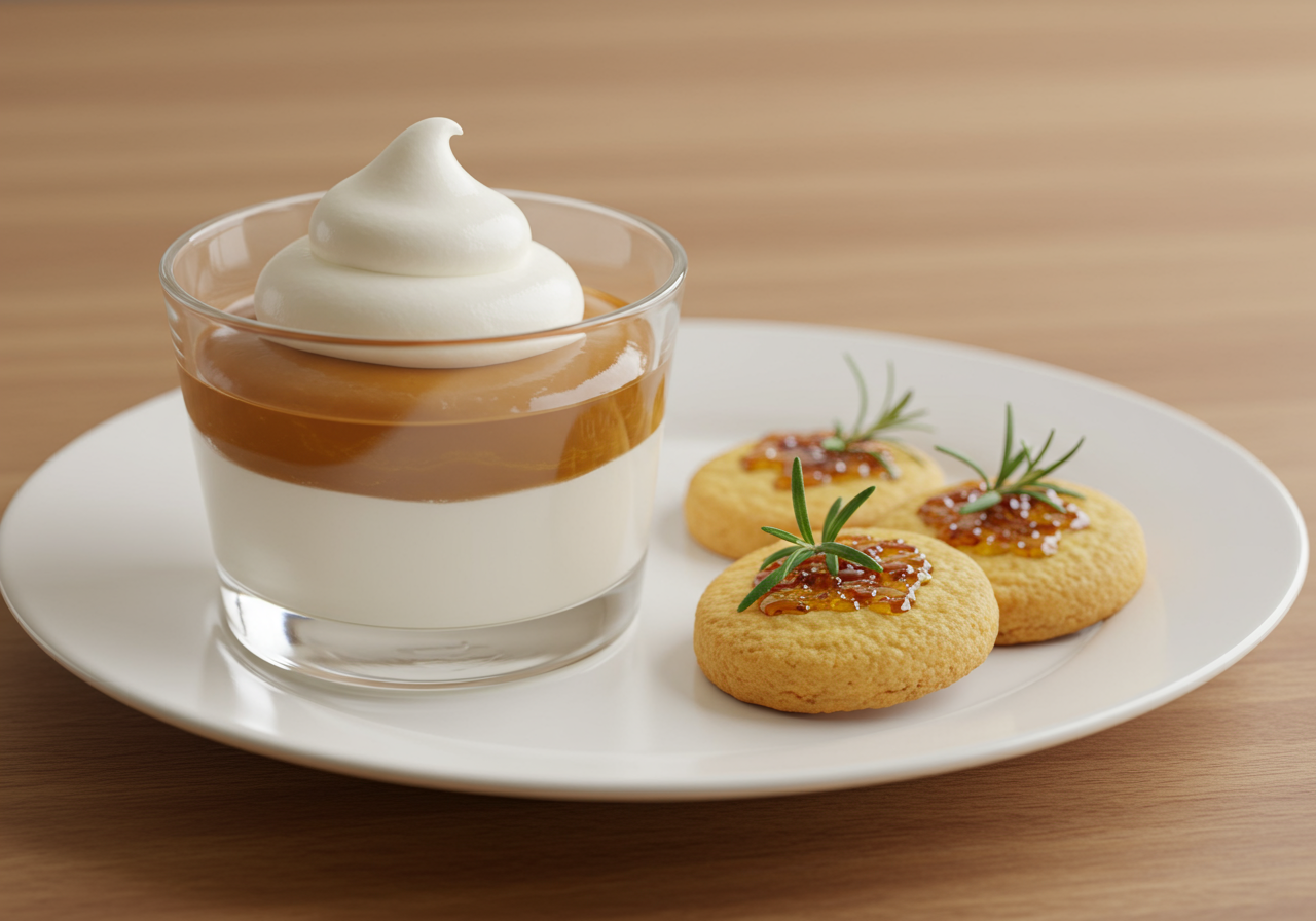 - Whip the whipping cream in a chilled medium bowl until it begins to thicken. Add the crème fraiche and beat until thick and fluffy. Spoon 1 tablespoon of the warm caramel sauce onto each budino, sprinkle with 1/8 teaspoon of fleur de sel, and add a dollop of whipped cream. Serve with a few cookies on the side.
