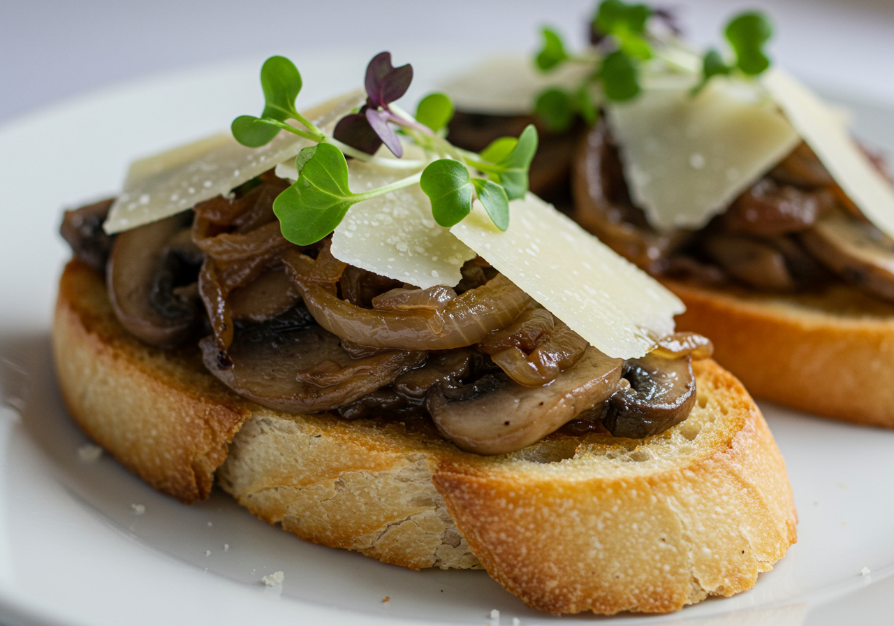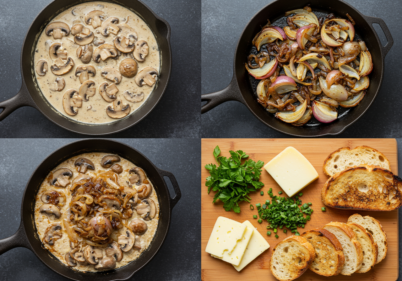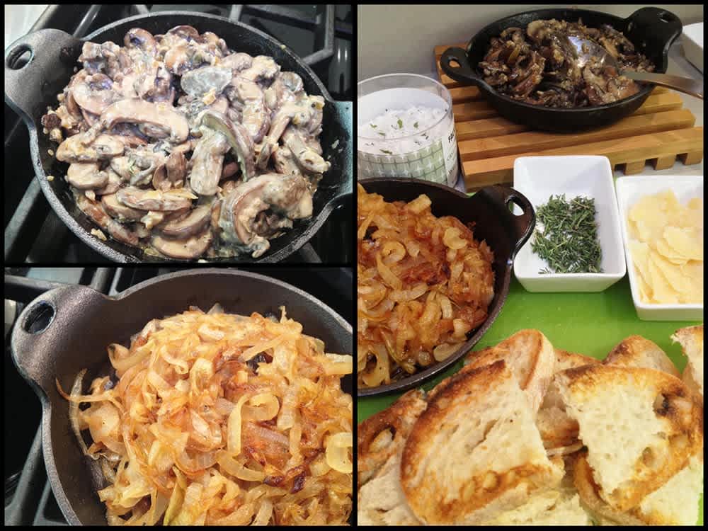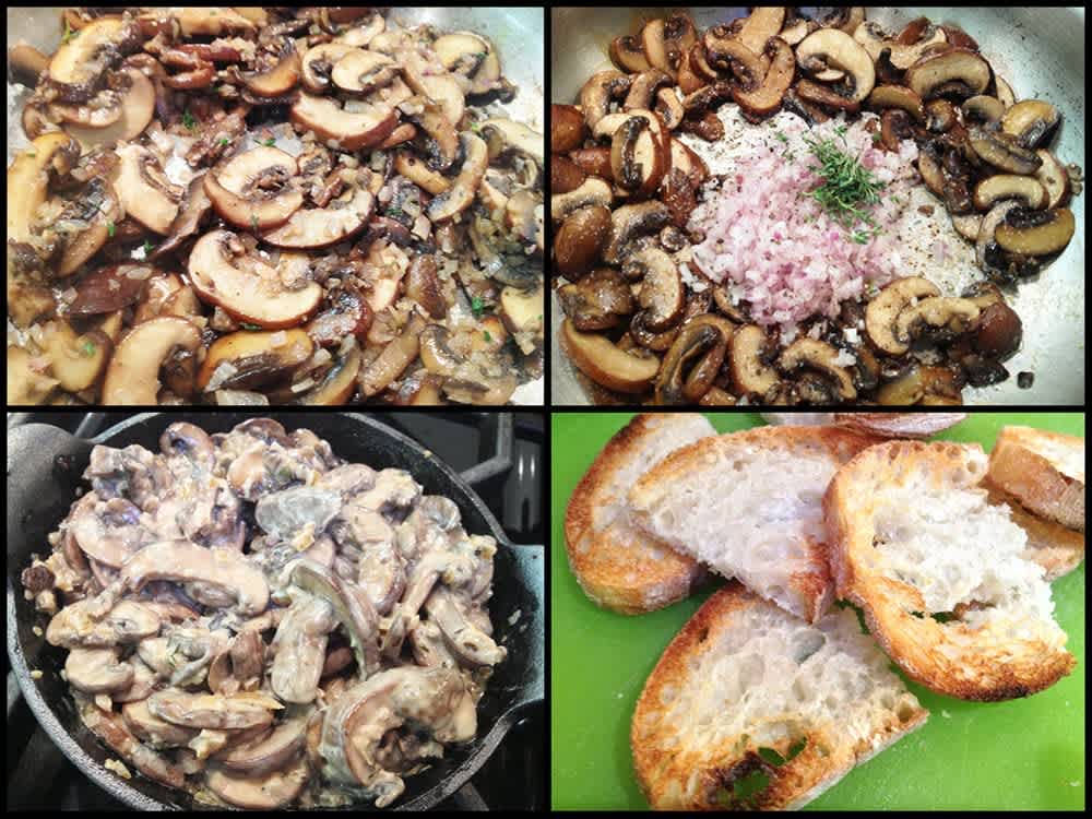 - Spread 2 tablespoons caramelized onions over each piece of toast, followed by approximately 1/4 cup of creamed mushrooms. Toast may be cut in half for smaller servings.