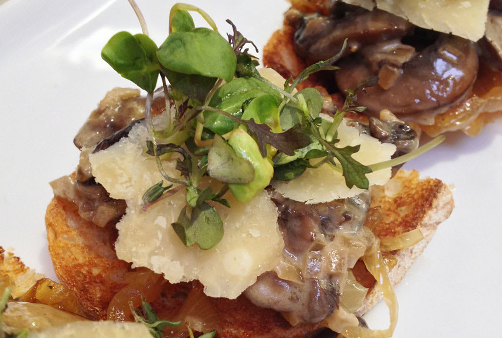 Grill or toast bread to a light char. Spread 2 tablespoons caramelized onions over each piece of toast, followed by approximately 1/4 cup of creamed mushrooms. Toast may be cut in half for smaller servings. Garnish with Parmigiano-Reggiano shavings, thyme leaves, microgreens and truffle oil.