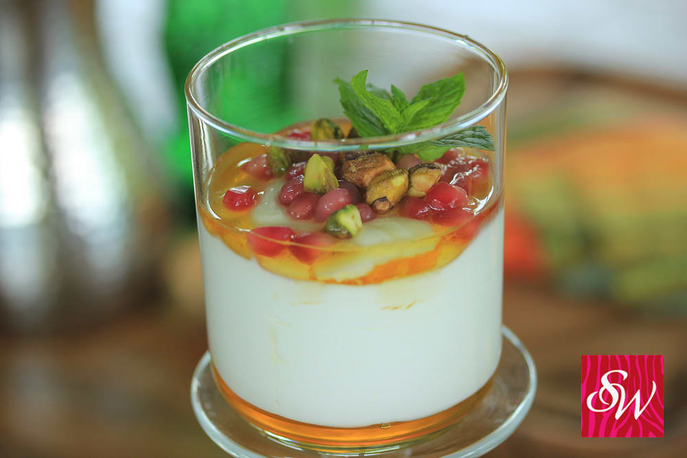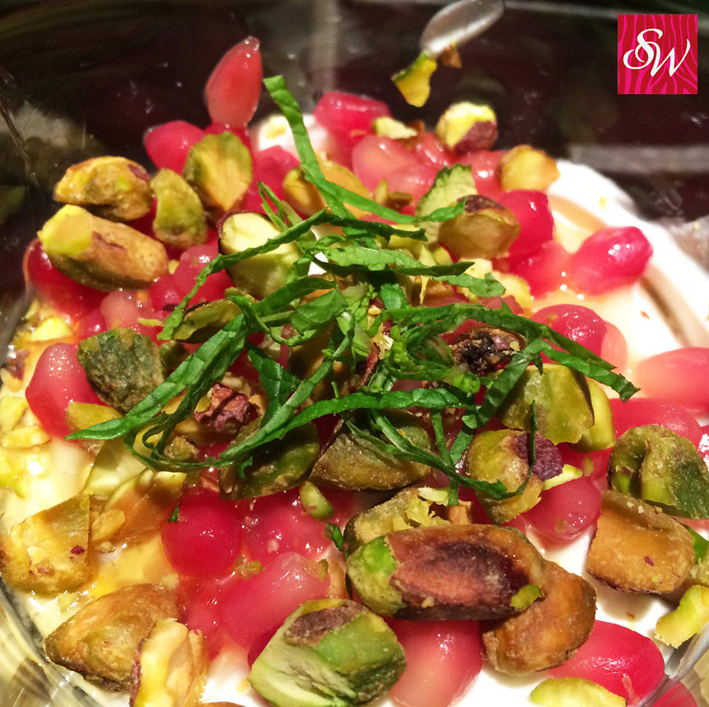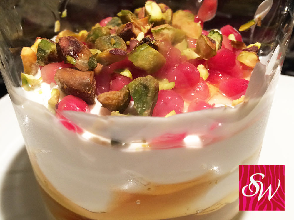 She created a simply perfect parfait, using Orange Blossom water, whipped with creamy Greek yogurt, layered with sweet honey, and topped with crunchy pistachios, sweet/tart pomegranates, and fresh mint.
