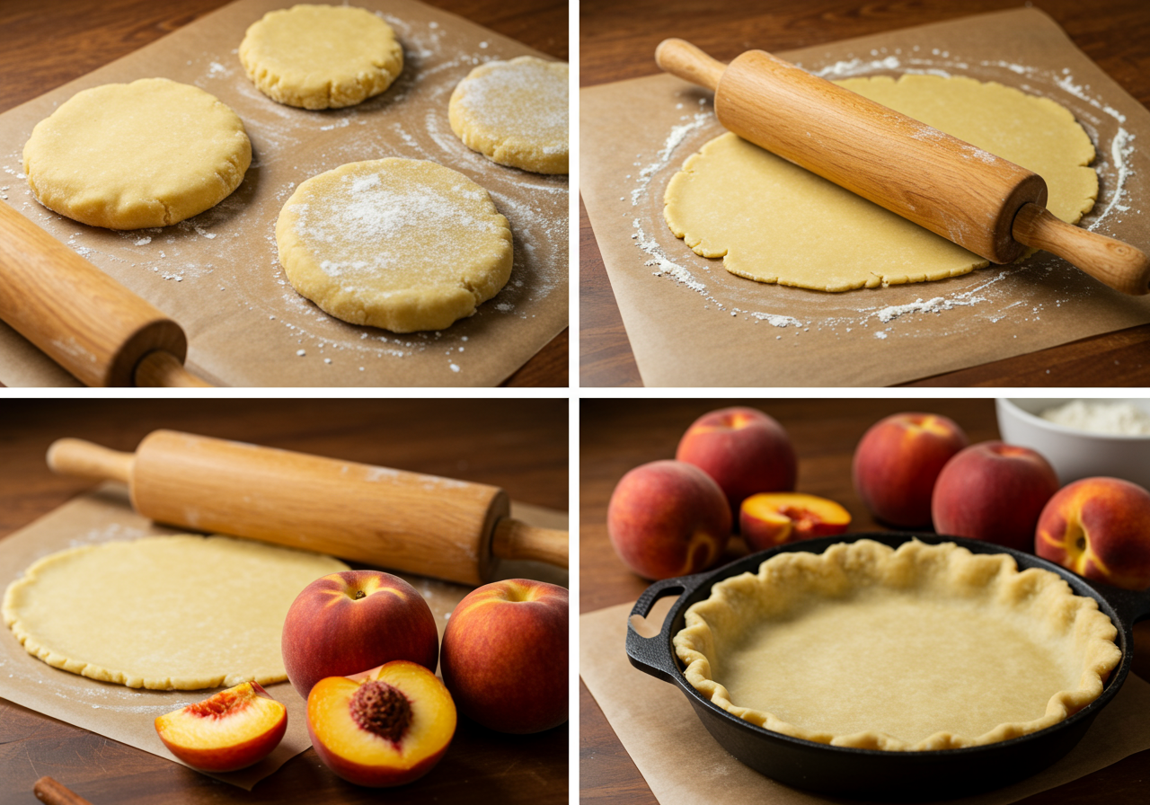 - Grease one larger baking dish or individual baking dishes as shown, with nonstick spray and distribute the filling evenly throughout the dish. Roll out topping with rolling pin until ¼-inch thick, (if you place each portion of topping in-between two pieces of parchment dusted with flour, rolling out each topping will be a breeze). Cover peaches with topping and bake in 350° oven until golden brown on top and hot through the center, approximately 30-45 minutes.