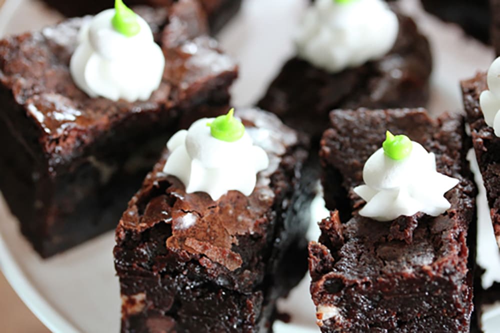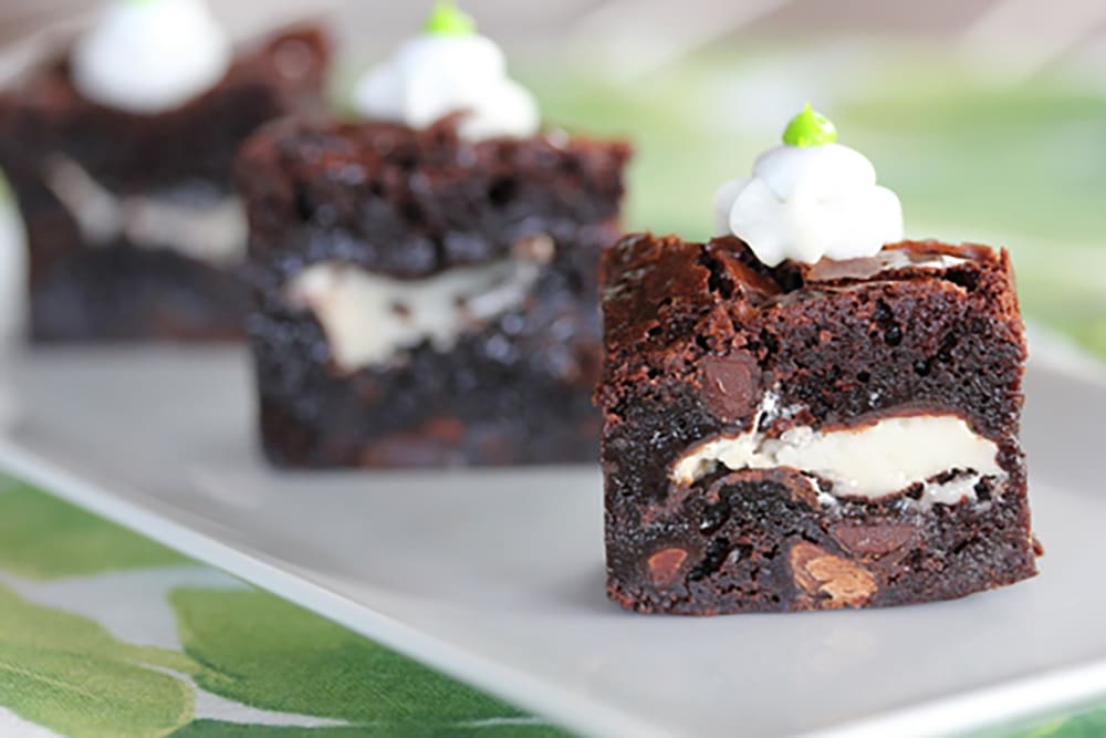 Rich chocolate minty brownies create the perfect combination of mouth melty goodness! Make plenty, they never last. Amazing with coffee or after dinner liqueurs. A nice touch is to bake extra and create a little to-go present for your guests, include a copy of the recipe…they will ask!