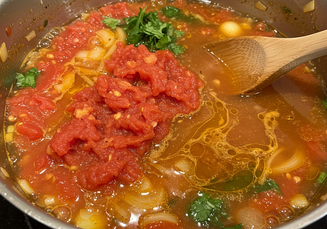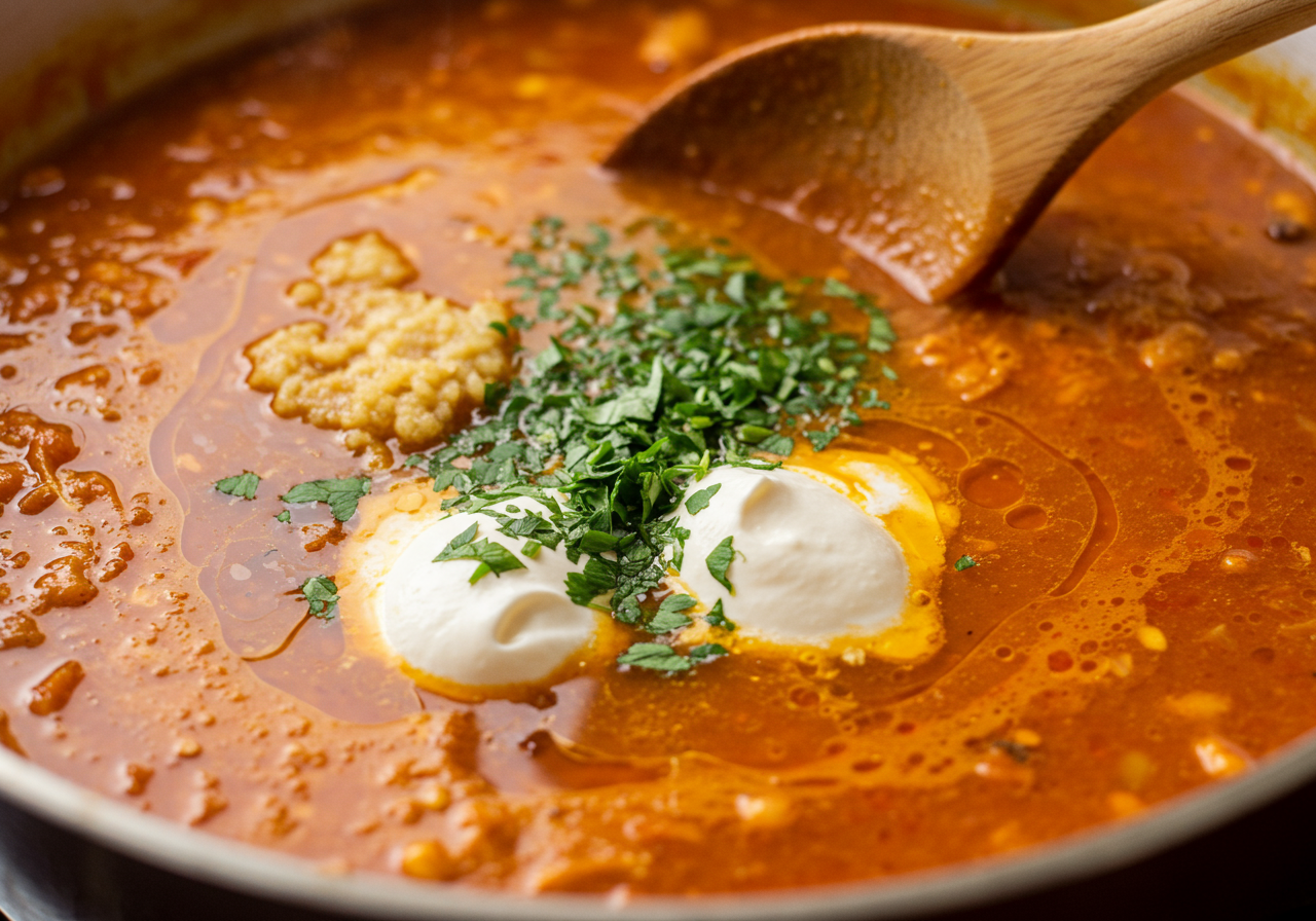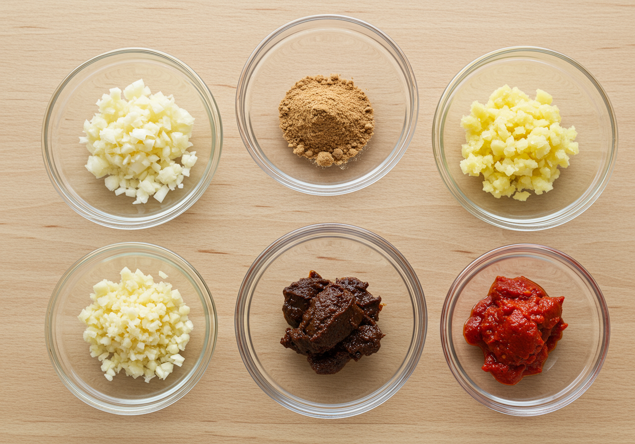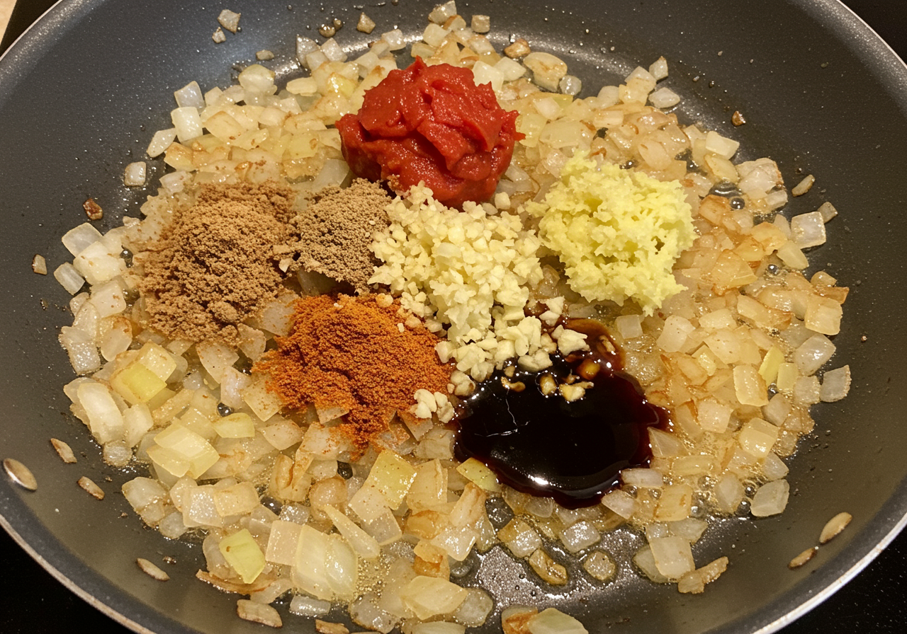 Add the garlic, ginger, demi-glace, tomato paste, cinnamon, coriander, nutmeg, cloves, and red pepper flakes. Cook, stirring constantly, until fragrant, about 1 minute.
