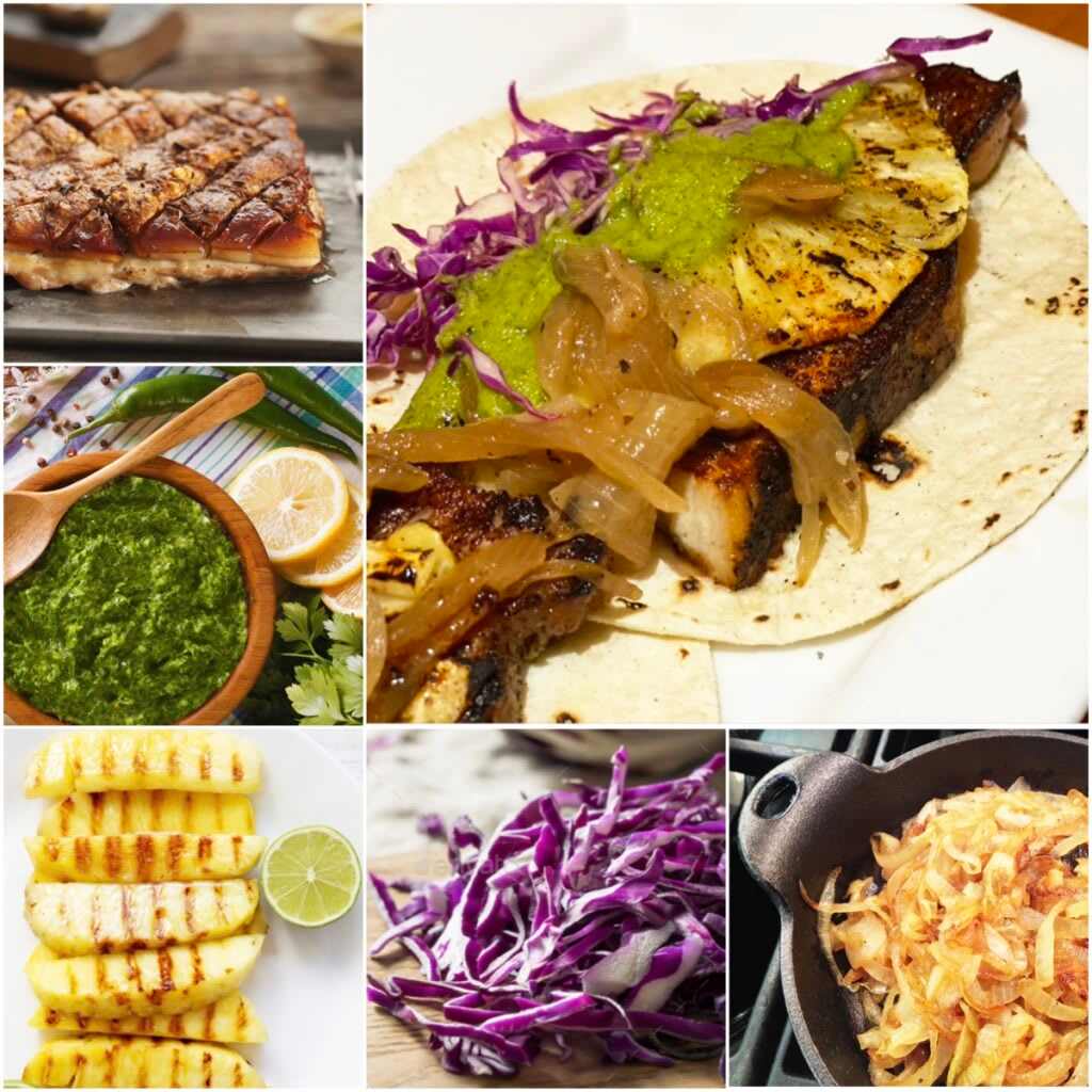 I’m not going to lie; these pork belly tacos with grilled pineapple, caramelized onions, and Serrano-cilantro aoli require a fair amount of prep, and the process is time-consuming, but the tacos are worth the effort as every bite is sublime. The main ingredients can be made ahead to make a day of prep a breeze. You can roast the pork belly 1-2 days in advance; the sauce can be prepped one day in advance.