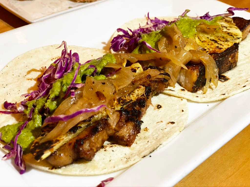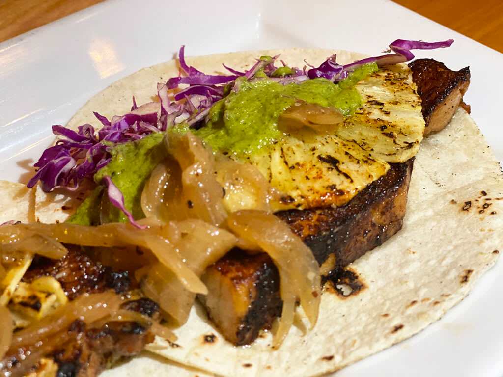 - Top with seared pork belly, seared pineapple, warm caramelized onions, Serrano-cilantro sauce, fresh cilantro leaves, dressed shredded cabbage, and serve.