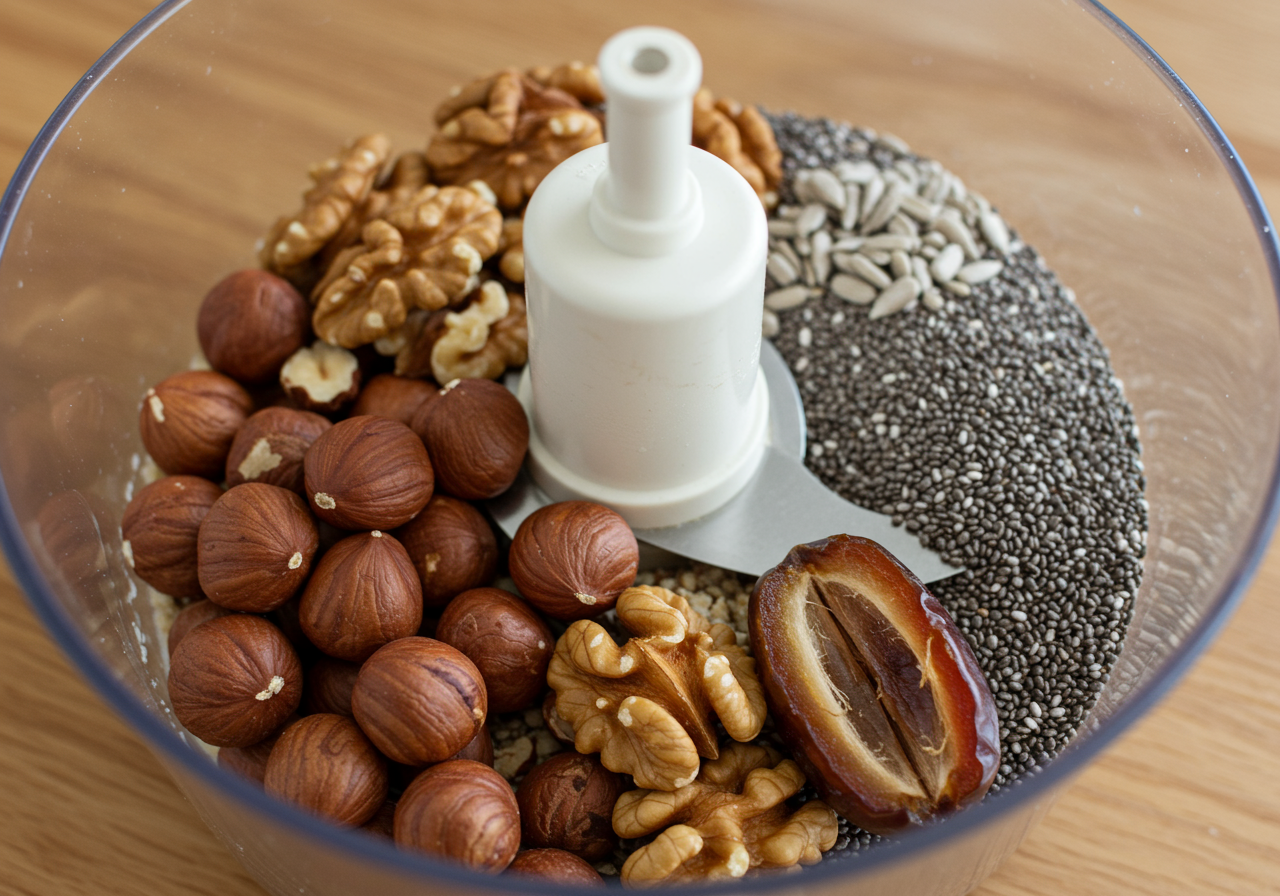 - Pulse nuts, dates and chia seeds in a blender or food processor until slightly stuck together, but not finely ground.