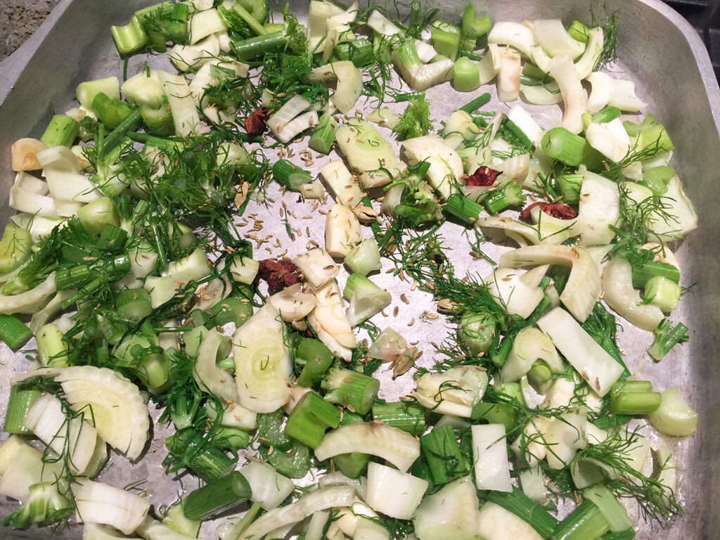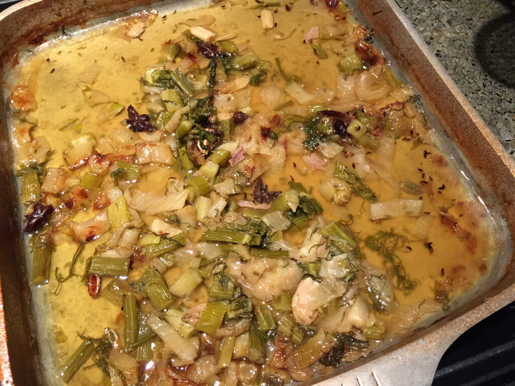 Fennel, bay leaves, garlic, cardamom, star anise, and half the fennel seeds into a hot roasting tray on the stovetop with a little oil.