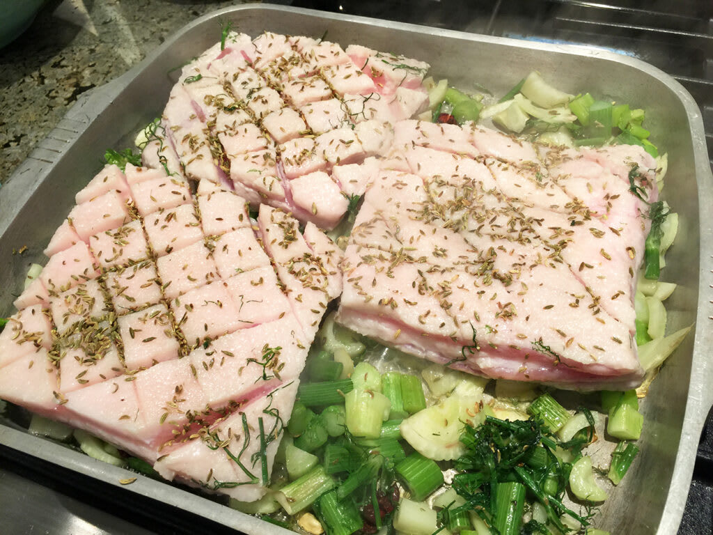- Score the pork belly skin diagonally in a diamond pattern at 1½ cm intervals. Season generously with salt and pepper, rubbing it well into the skin.