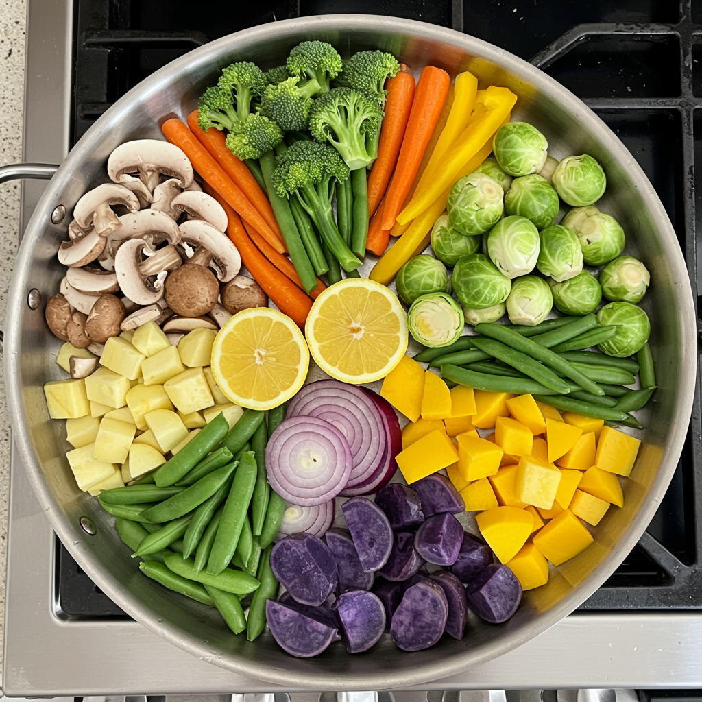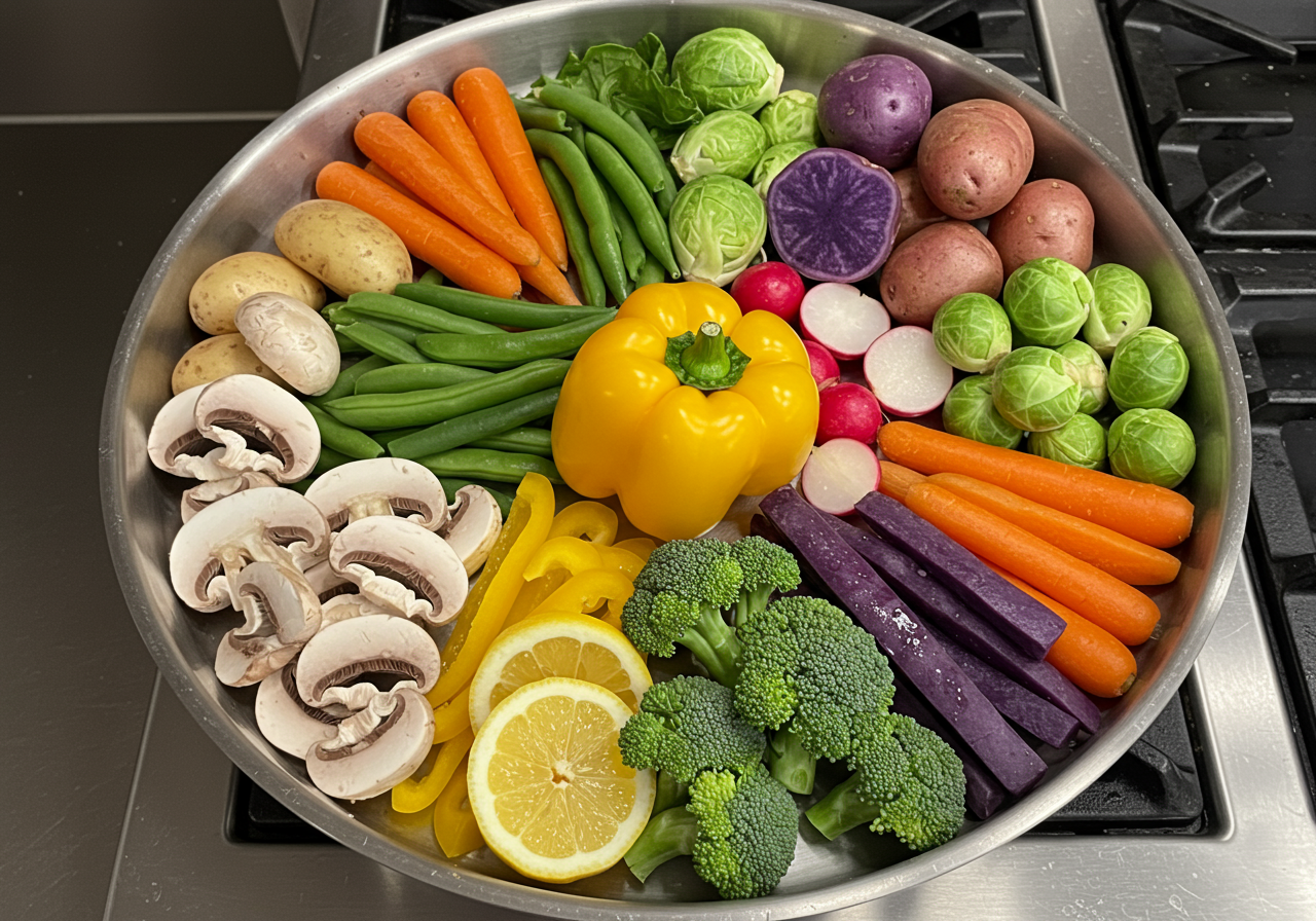 - Choose several kinds of vegetables, in a variety of colors. Have enough to fill the pan you you plan to use.