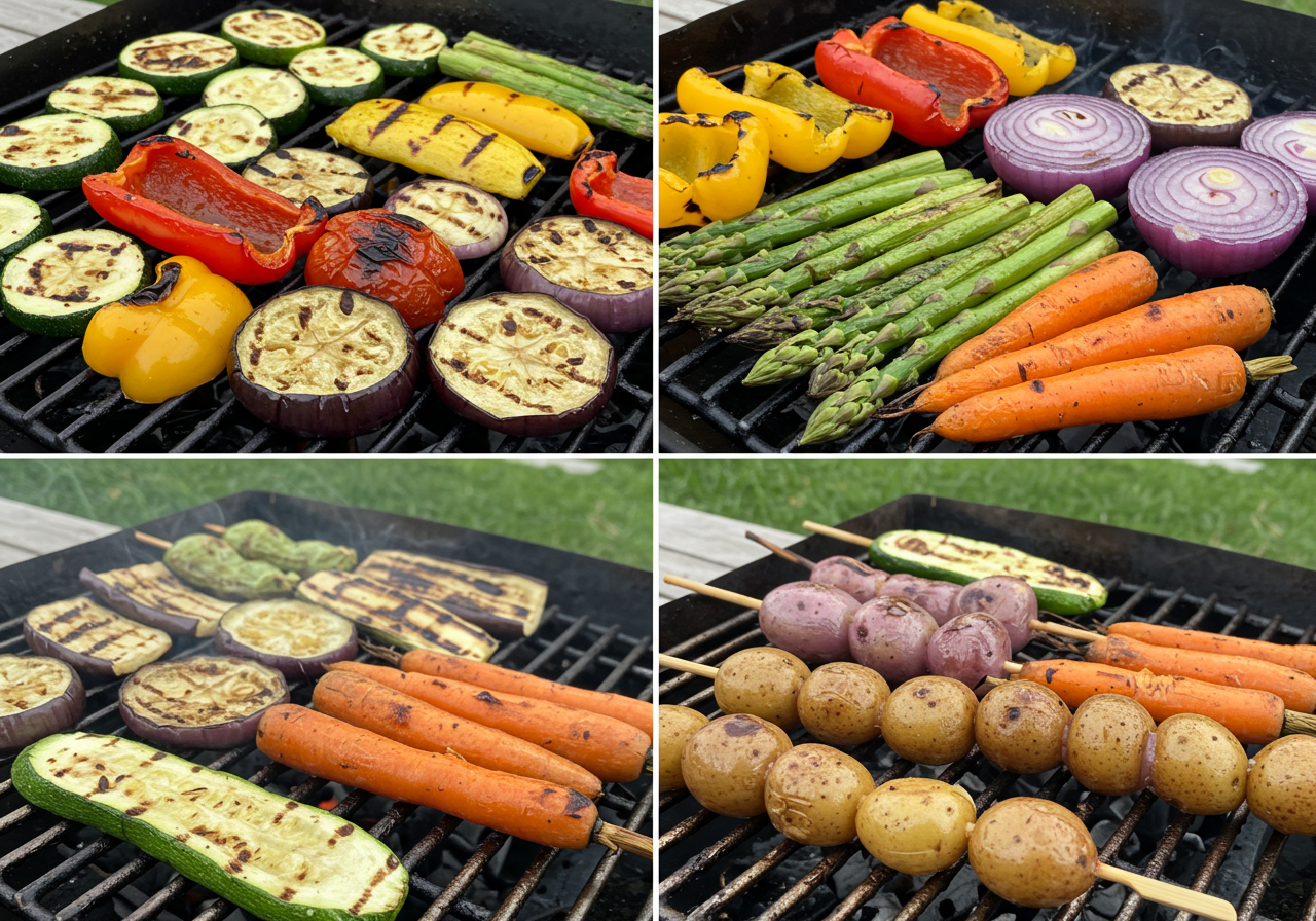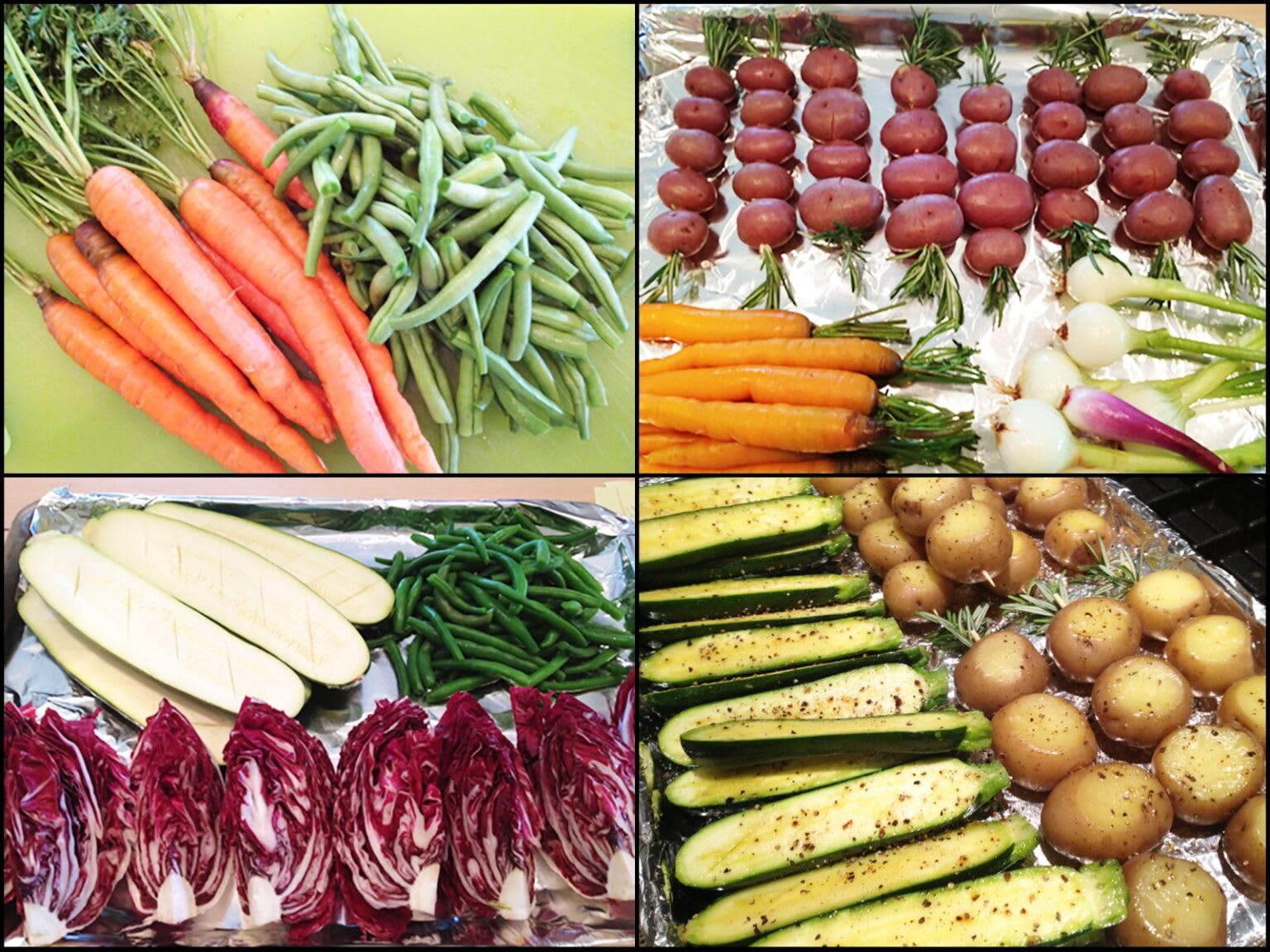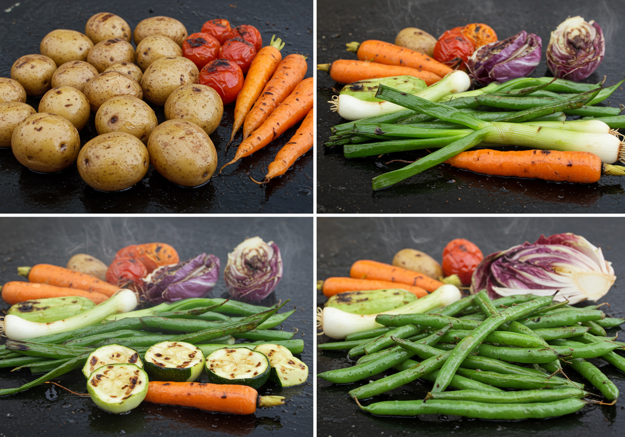 - Brush the vegetables including potato skewers with 1/4 cup of the oil to coat lightly. Sprinkle the vegetables with salt and pepper. Working in batches, grill the vegetables until tender and lightly charred all over, about 8 to 10 minutes for the peppers, carrots and onions; 7 minutes for the zucchini and green beens, 4 minutes for the radicchio and asparagus.