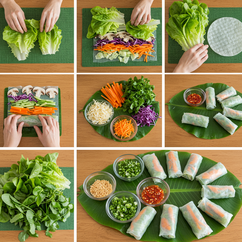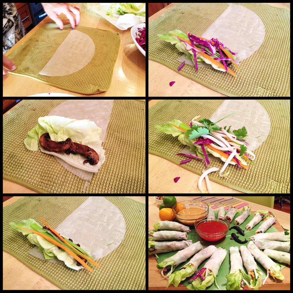 - Fold the rice paper in half to make a half-moon shape. First add a butter lettuce leaf, top with savory mushrooms, followed by remaining veggies at the bottom of the wrapper and roll up tightly. Place the rolls on a platter and cover with a barely damp towel to keep moist. The rolls can be made and refrigerated up to 2 hours ahead. Serve chilled with the Peanut Sauce for dipping.