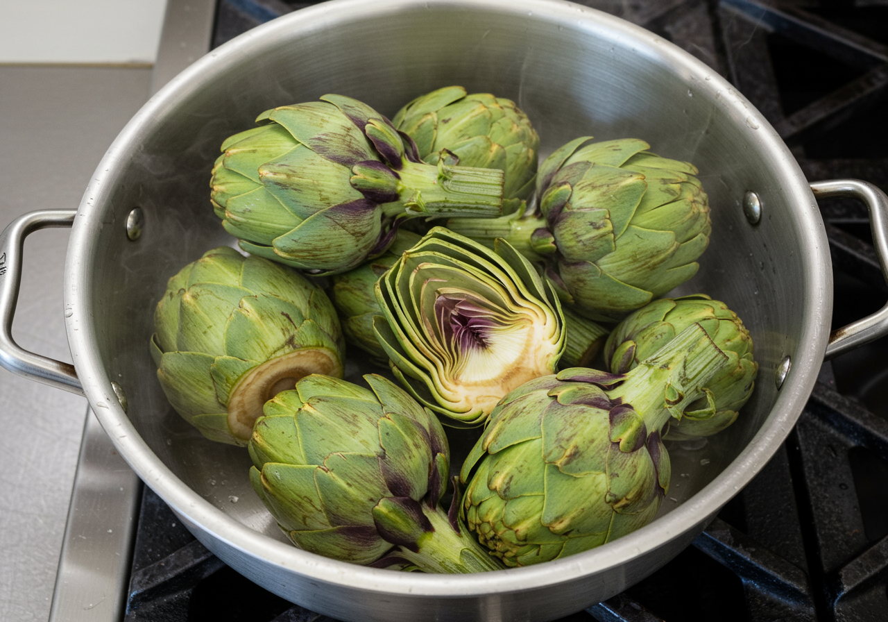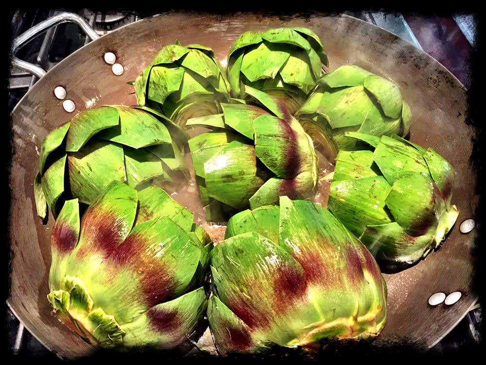 - Brown all six artichokes cut side down until they a golden brown. Reduce heat and add the stock.