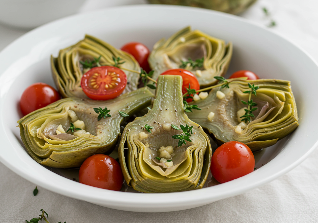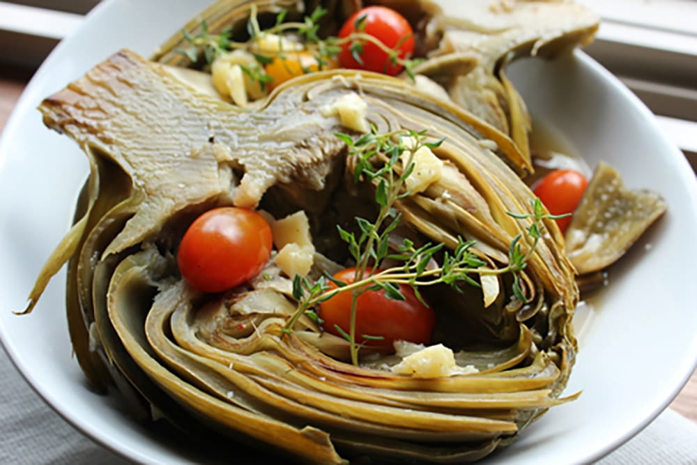 Simple and deliciously perfect! A braised, flavorful artichoke is a treat and this recipe is fantastic. It takes a bit of prep time but it is well worth it. We enjoy serving these as a first course for a dinner party but they are also a great vegetarian option or a light dinner option with a nice glass of white wine. This recipe was inspired by a dear friend and one of our favorite chef’s Dena Marino.