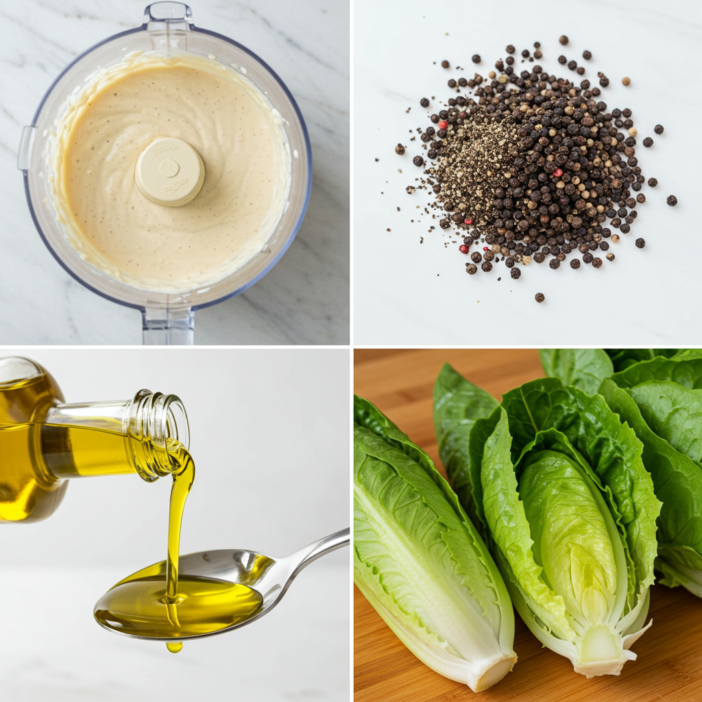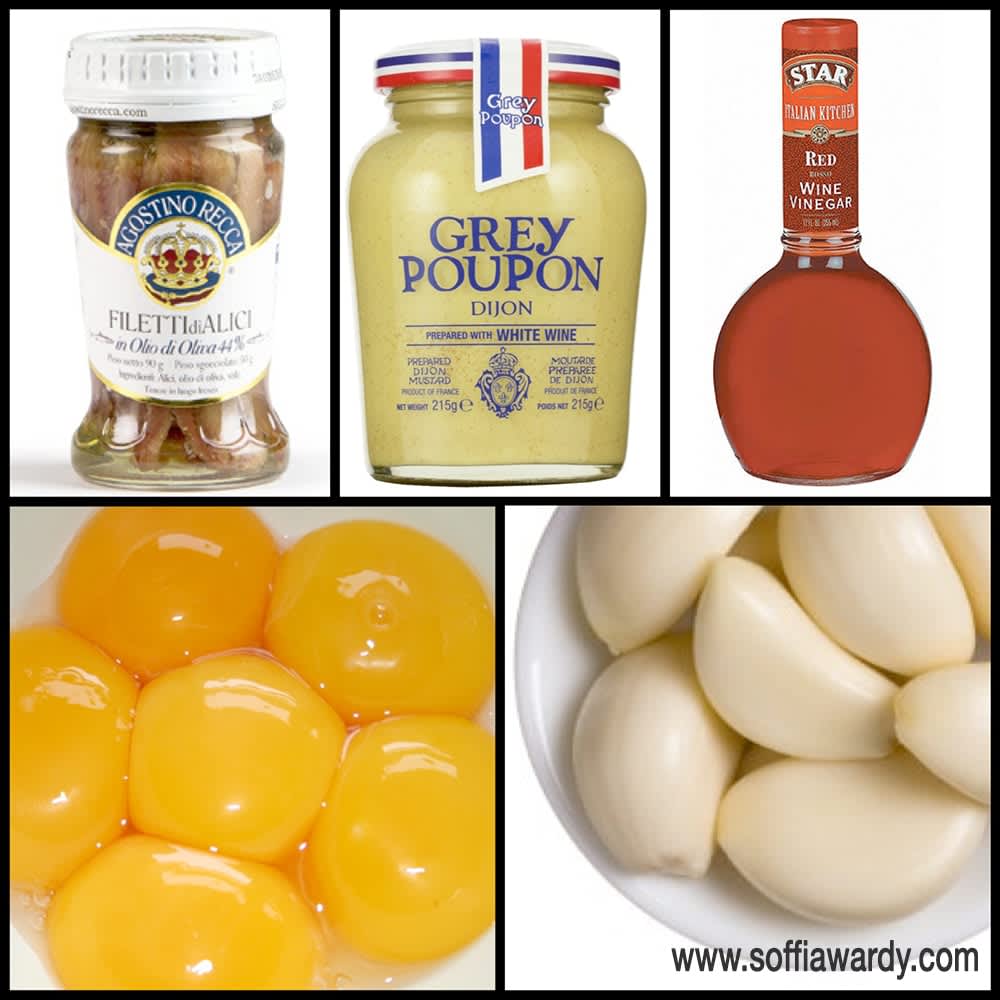 - To prepare the dressing, place the anchovies, garlic, egg yolks, mustard, vinegar, lemon juice, Worcestershire sauce, Tabasco sauce, pepper, and Parmigiano Reggiano cheese in a blender or food processor and puree.