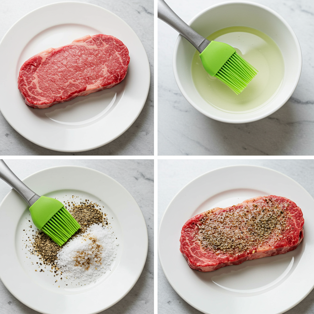 - Meanwhile, pat the steaks dry with a paper towel and brush them lightly with vegetable oil. Combine the salt and cracked pepper on a plate and roll the steaks in the mixture, pressing lightly to evenly coat all sides.