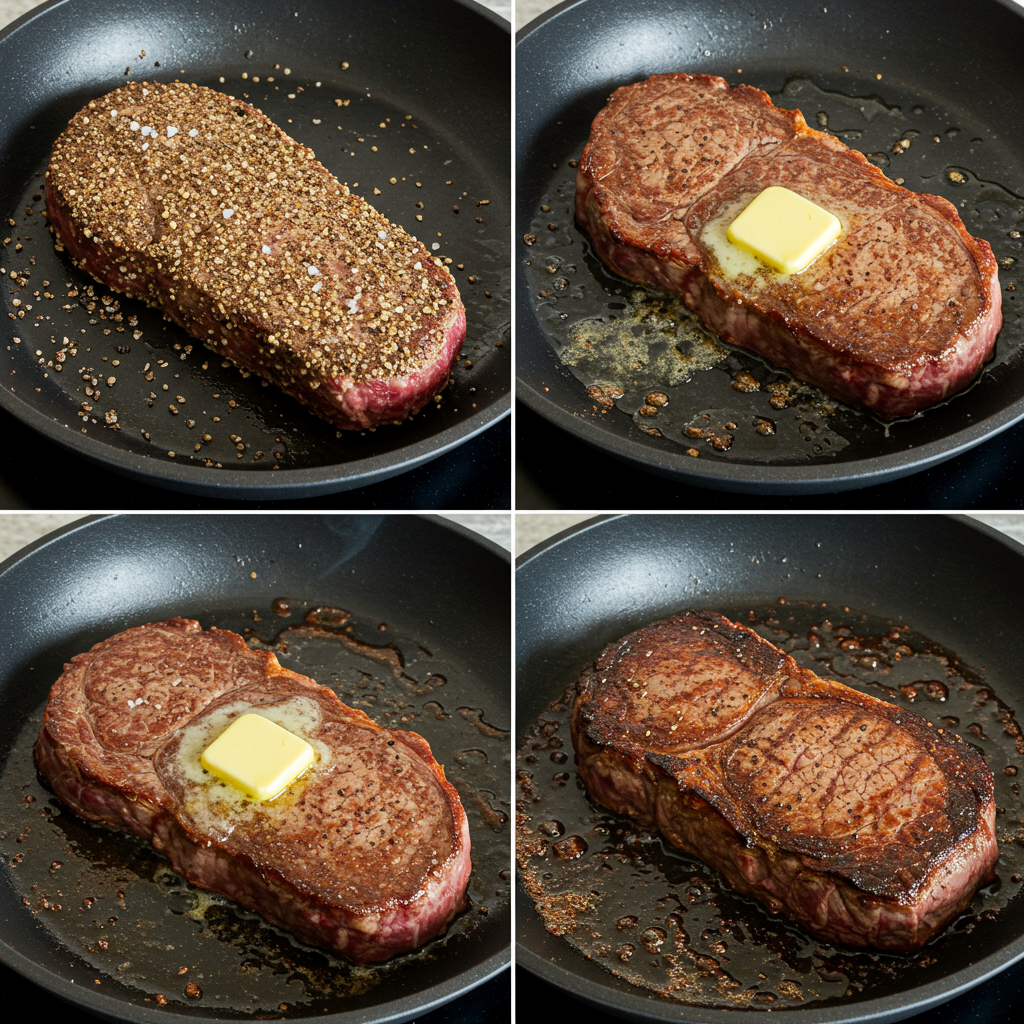 - When the skillet is ready, add the steaks and sear them evenly on all sides for about 2 minutes per side, for a total of 10 minutes. Top each steak with a tablespoon of butter, if using, and place the skillet in the oven. Cook the steaks until they reach 120 degrees F for rare or 125 degrees F for medium-rare on an instant-read thermometer. (To test the steaks, insert the thermometer sideways to be sure you’re actually testing the middle of the steak.) Remove the steaks to a serving platter, cover tightly with aluminum foil and allow to rest at room temperature for 10 minutes.