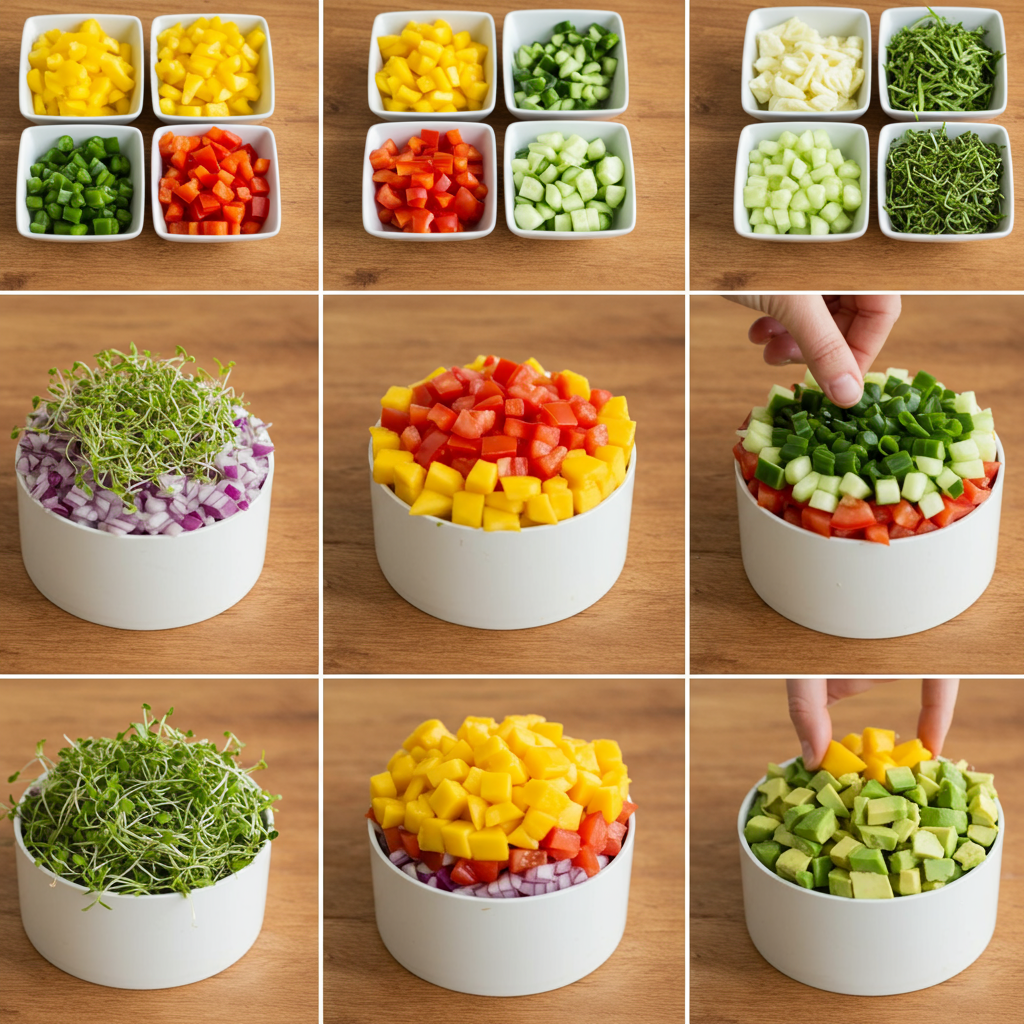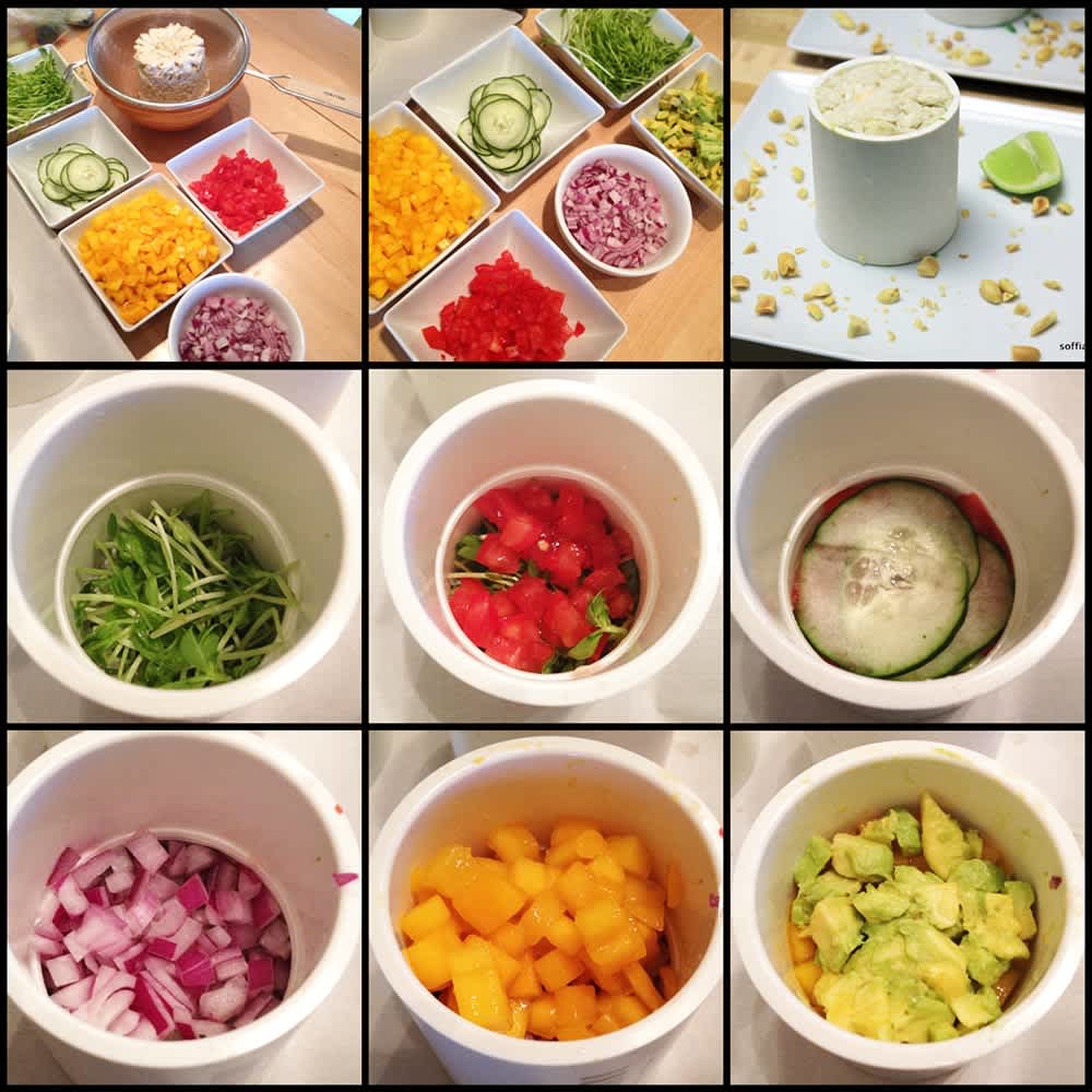 - Assemble Crab Stack: With pea shoots at the bottom and crab meat at the top, tightly layer pea shoots, tomatoes, cucumber, onion, mango, avocado, and crab into a mold.