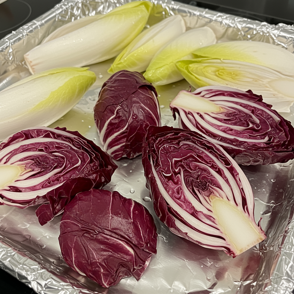 - Slice the radicchio and endive lengthwise, coat with olive oil salt and pepper, grill a few minutes on each side until slightly charred.