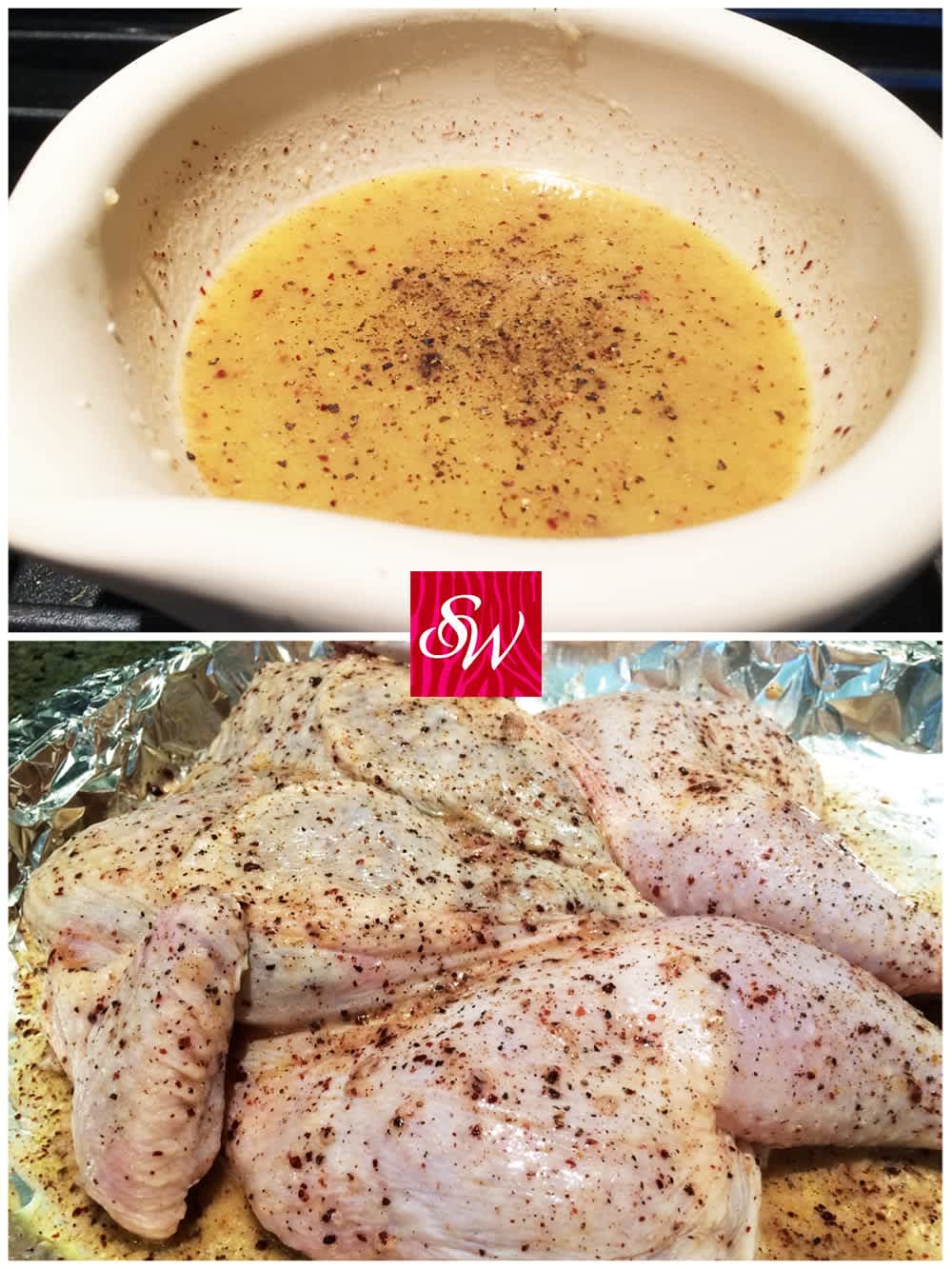 - Rinse and pat the chicken dry with paper towels; place on a large rimmed baking sheet. Using fingertips, loosen skin of the breast meat. Brush some dressing under the skin and onto the breast meat. Brush the chicken all over with the remaining dressing. DO AHEAD Can be made 2 hours ahead. Let stand at room temperature.