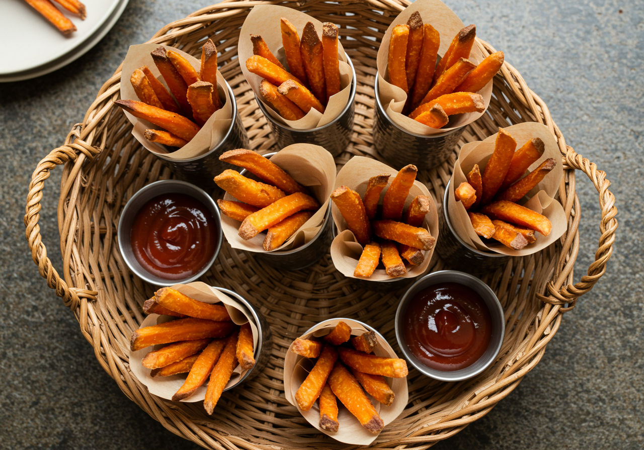 At the time I was planning the dinner party I mentioned above, inspired by Thai Street Food. I started thinking how fun it would be to serve spicy, crispy, sweet potato fries in a cone with a Thai inspired ketchup. The Hak’s on it’s own would be too barbecue-y so I decided to doctor it up, by adding some fresh ingredients along with some spicy and sweet Thai chile sauces. When I had it all mixed up I did a happy dance and you will too. Add a bit more or less Sambal if you want it spicier but the fries are already spicy and the fresh ginger adds extra kick, so be careful.
