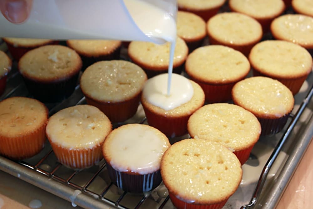 - Using a glass Pyrex mixing cup, pour milk mixture (1/2 oz.) over top of each cupcake, filling each hole. Refrigerate for 2 hours or overnight before icing