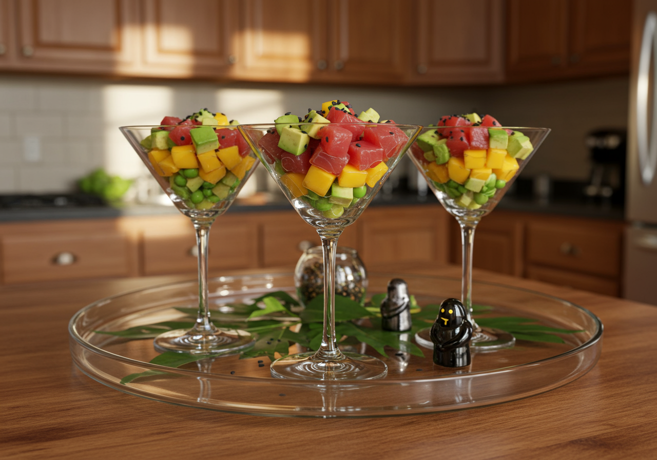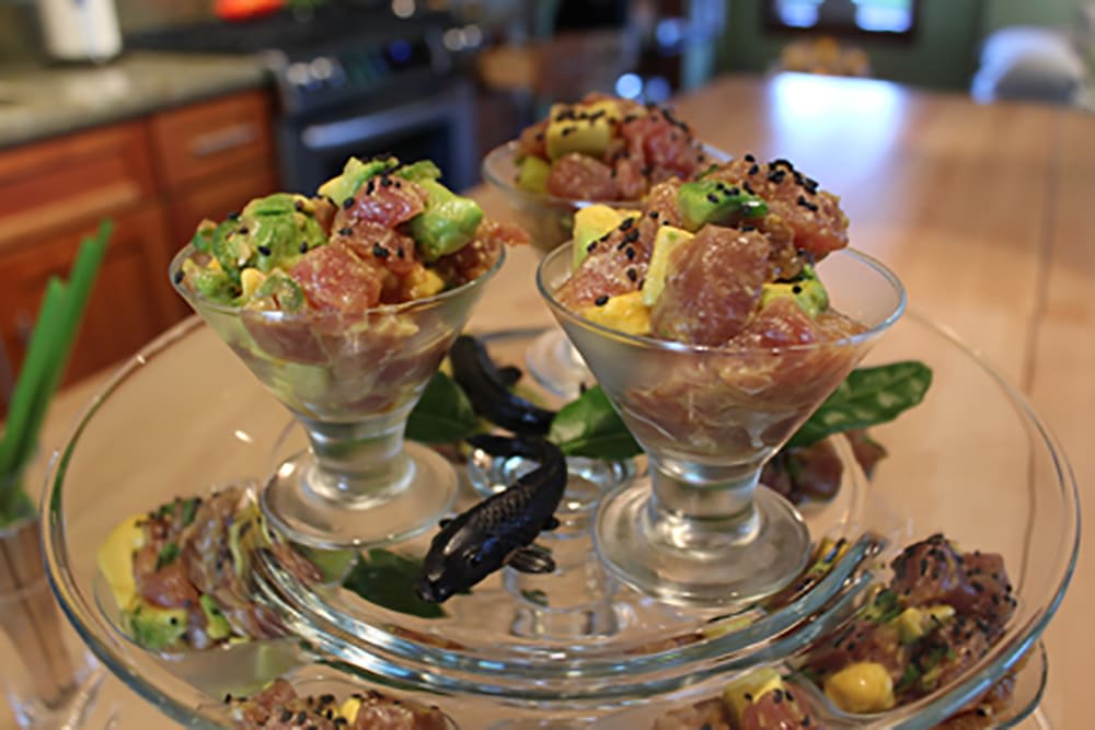 Fresh and delicious, this is a great small-bite appetizer to serve at a cocktail party. We served the Poke in mini-martini glasses on cake tiers for effect. We garnished the tiers with kaffir lime leaves from our tree and small iron koi-fish that we use as chop stick rests. We placed two glasses adjacent to the tiers, one with mini-cocktail forks and one with chopsticks, so that each guest could choose. Chilling your serving bowls ahead keeps each dish nice and cool as cocktails are passed.