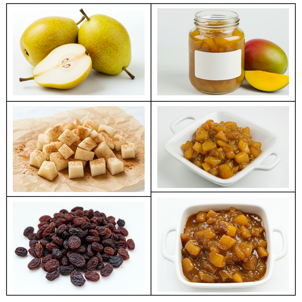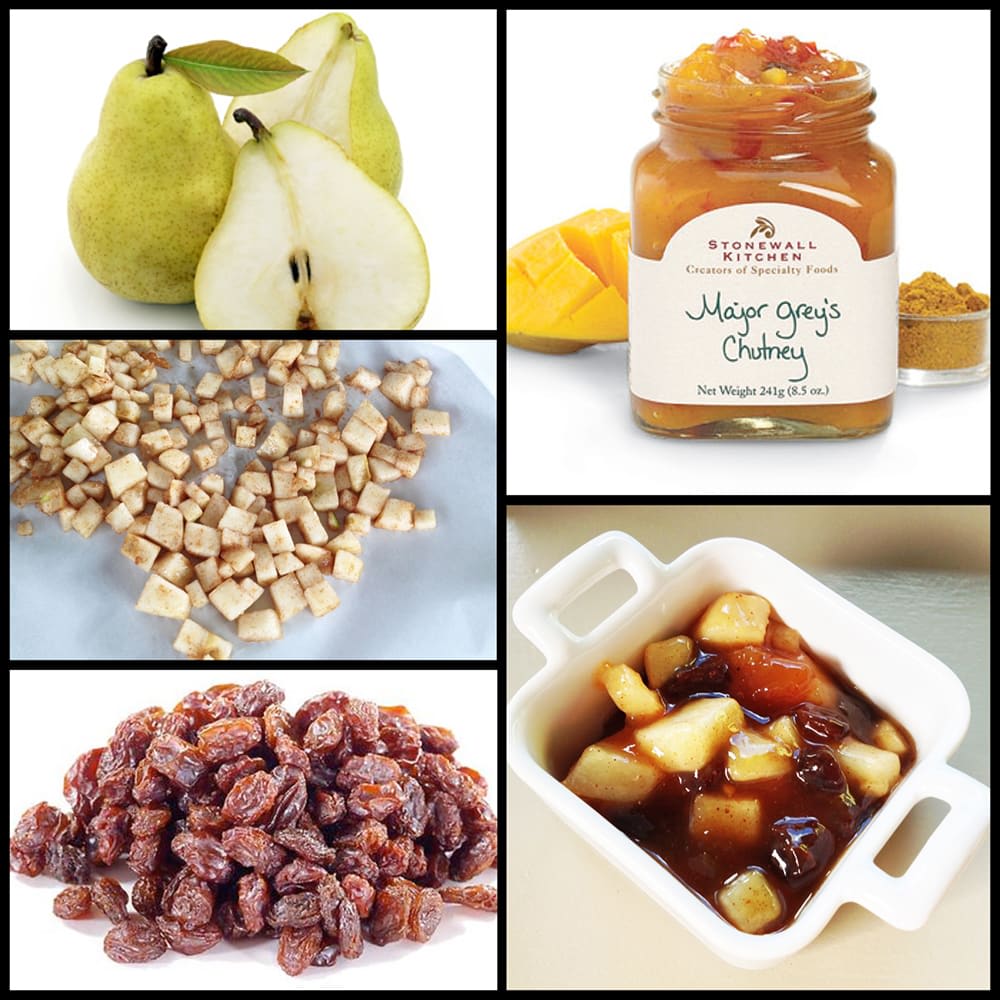 - Meanwhile, to make the chutney mixture, preheat oven to 350°. Toss the diced pears with the cinnamon and salt. Bake on a parchment-lined cookie sheet for 10 minutes. Cool and mix with the chutney and currants or raisins.