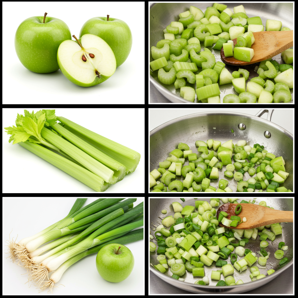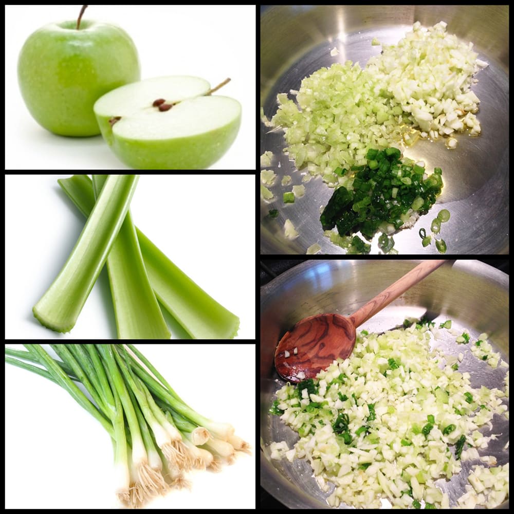 - Sauté the scallions, celery and apples in the oil until tender. Let cool.