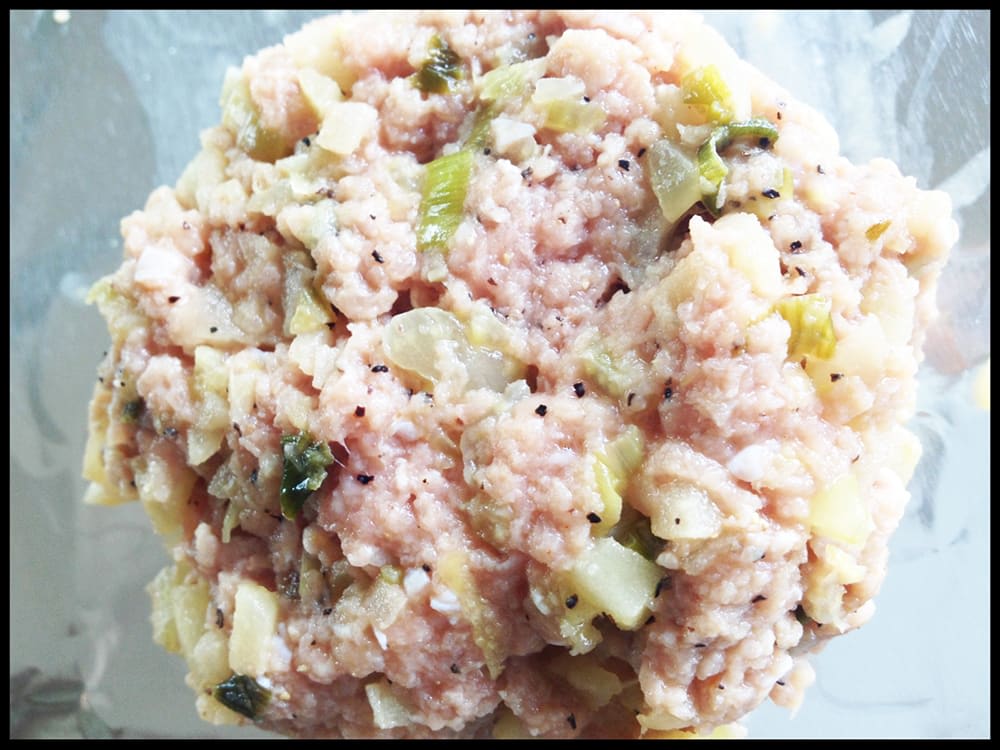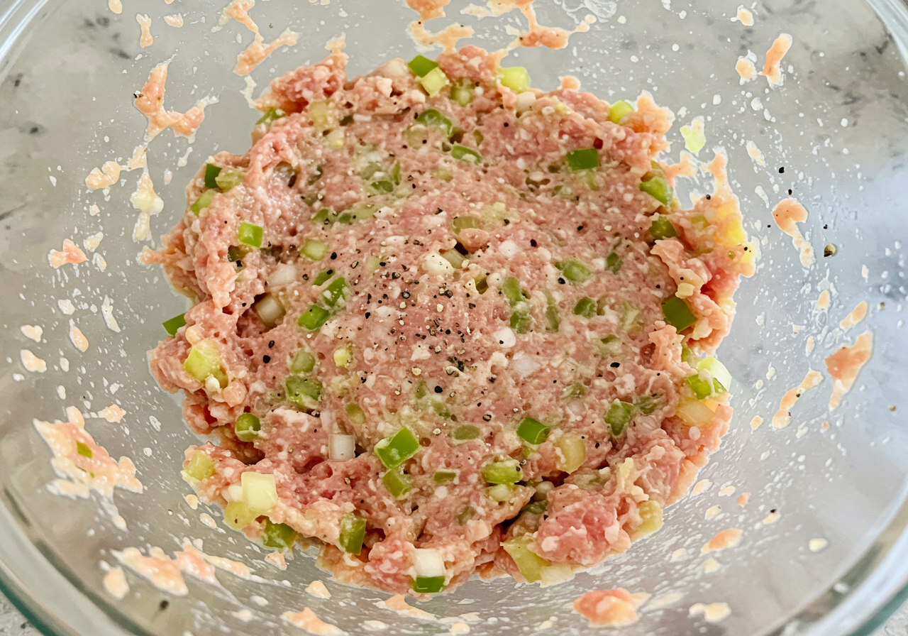 - Place the ground turkey or chicken in a large mixing bowl. Add sautéed items and the remaining ingredients.