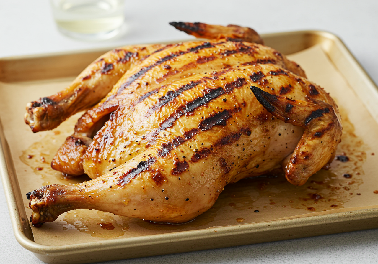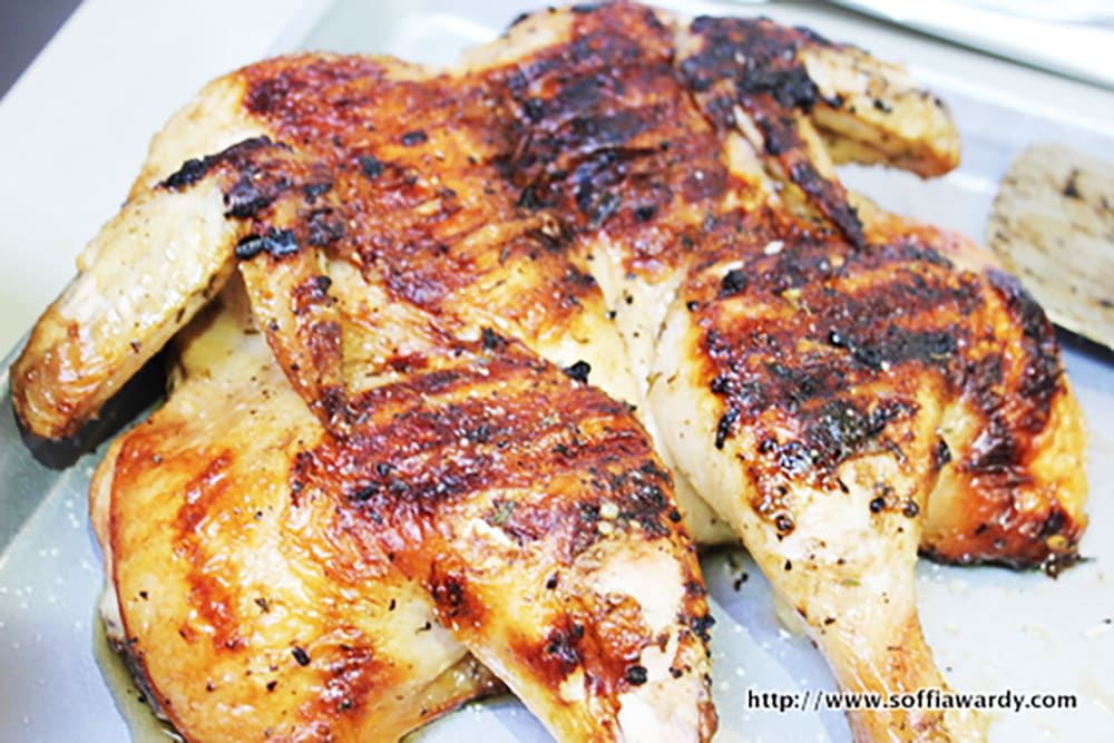 Place the chicken in a ceramic or glass dish just large enough to hold it flat. Pour the lemon marinade over the chicken, turning it in the dish. Cover the dish with plastic wrap and refrigerate overnight. Turn the chicken 2 or 3 times while marinating. When ready to grill, prepare a hot charcoal fire on 1 side of a grill (or turn a gas grill on low heat). Spread 1/4 of the coals across the other side of the grill. Place the chicken on the cooler side, skin side up and weigh it down, using either a pan or grill weight. (a pizza stone covered in foil works extremely well).