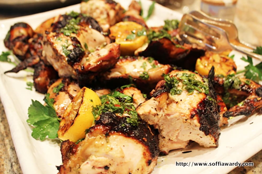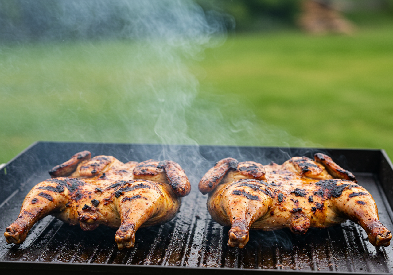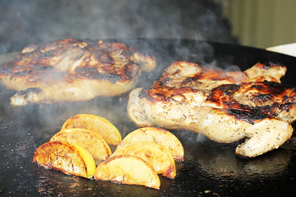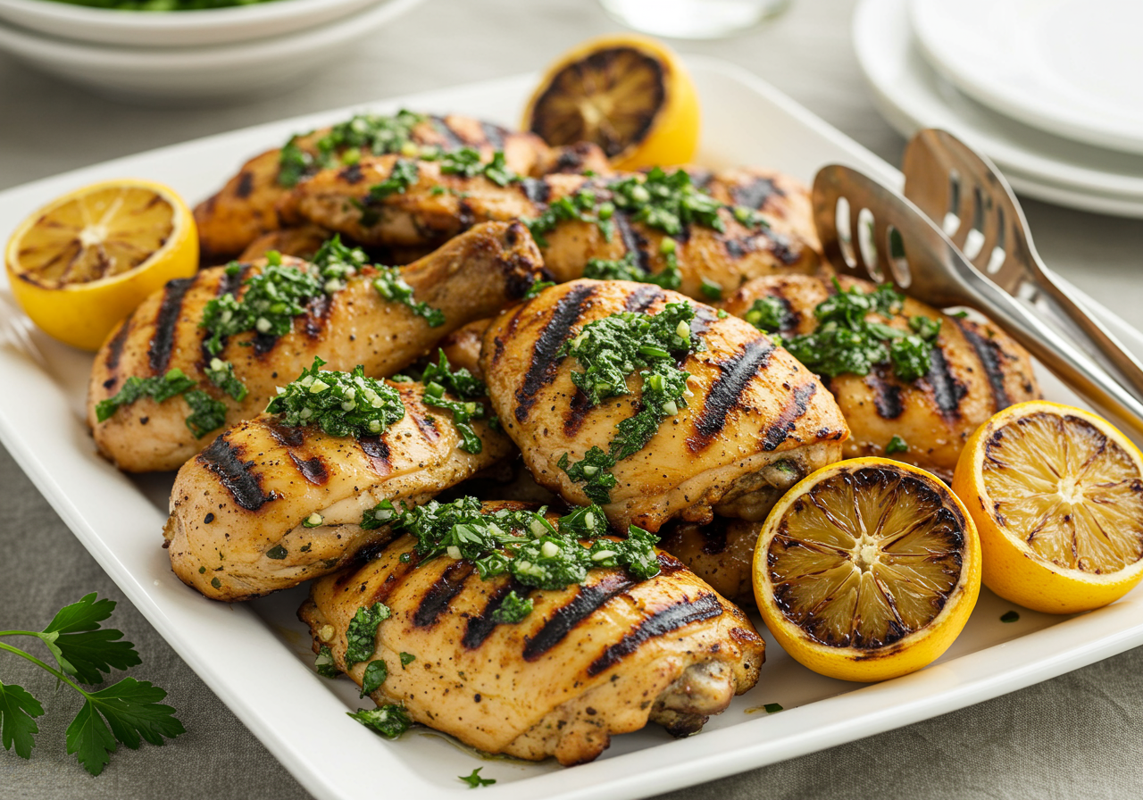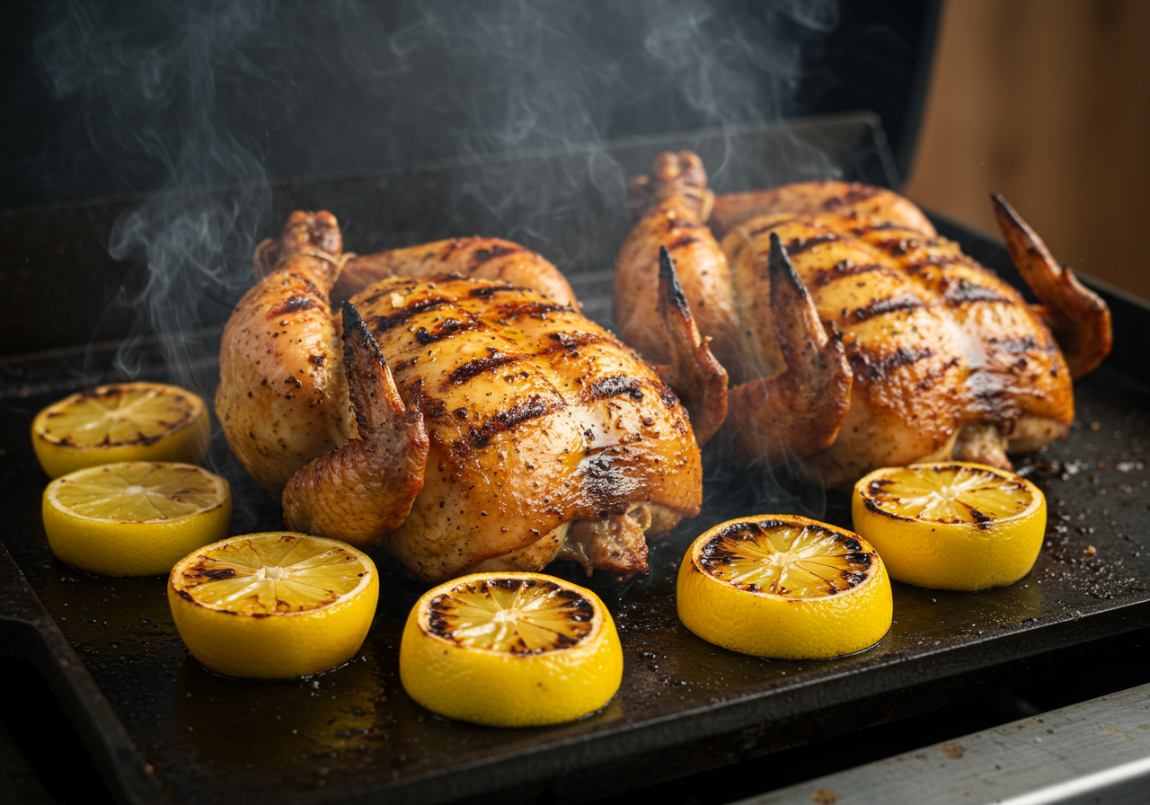 Remove the chicken to a plate or cutting board, cover with aluminum foil, and allow to rest for 5 minutes. Cut in quarters or smaller pieces, sprinkle with salt, serve with the grilled lemon halves and sprinkle with fresh herbs.