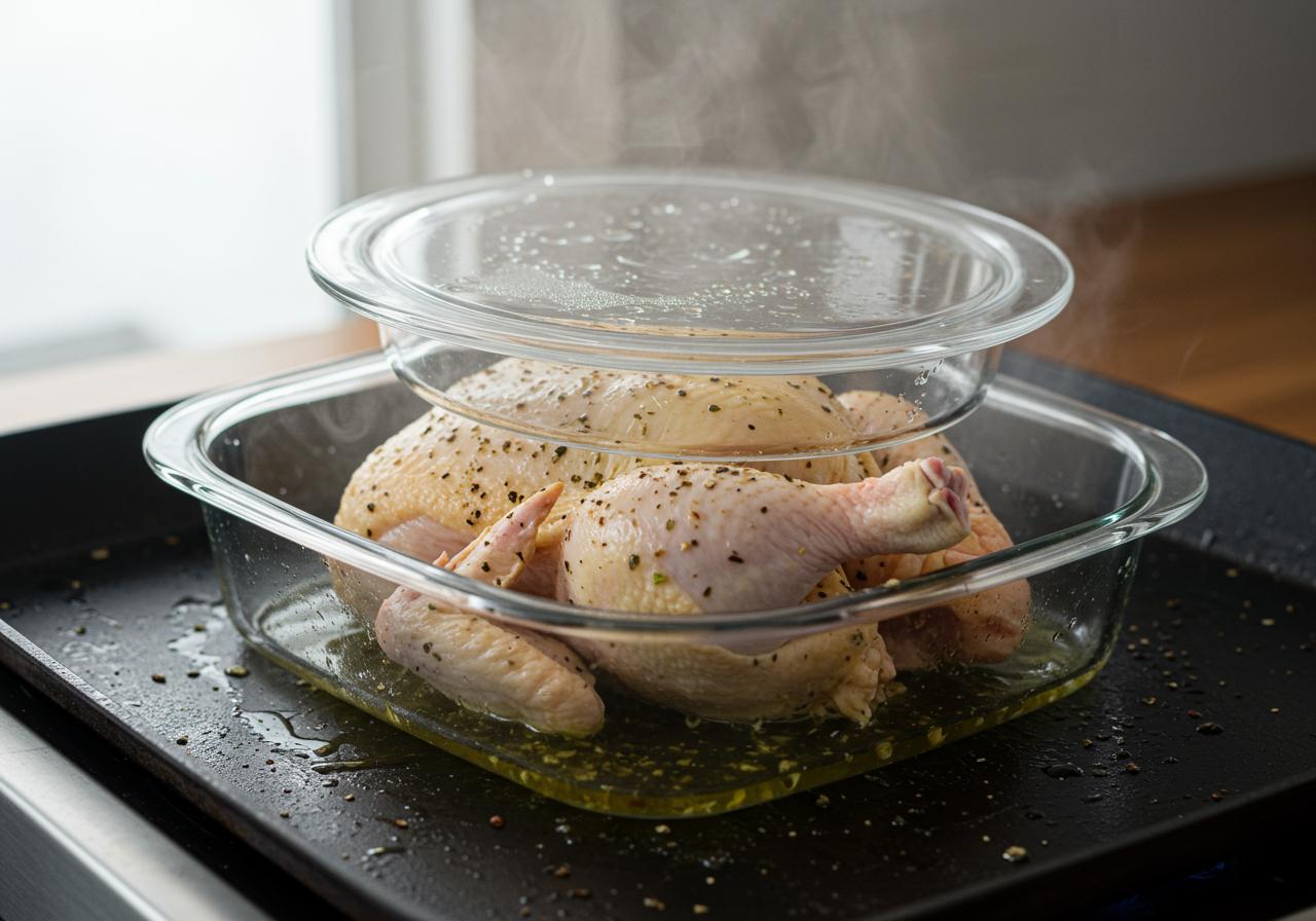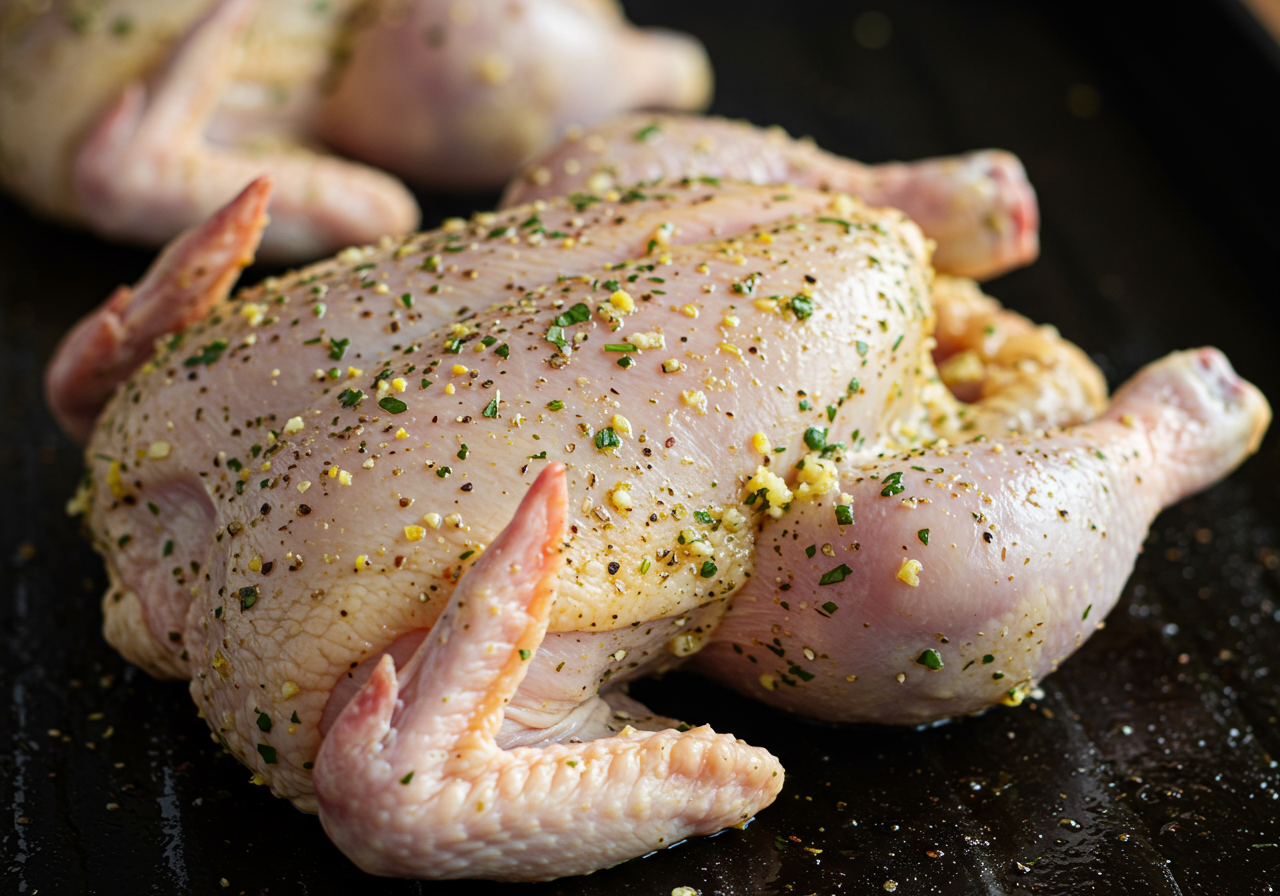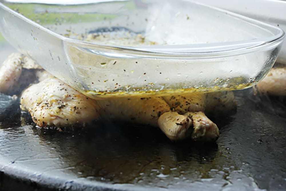 - Place the chicken in a ceramic or glass dish just large enough to hold it flat. Pour the lemon marinade over the chicken, turning it in the dish.
