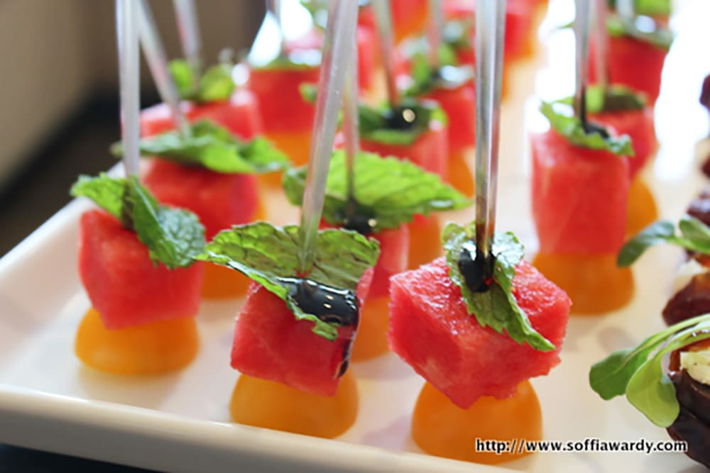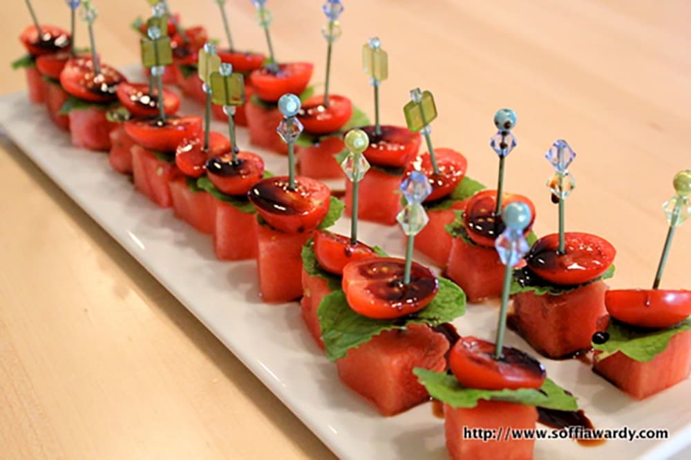 - Using a pic first push a tomato half cut side up, followed by a mint leaf and finally a watermelon cube.